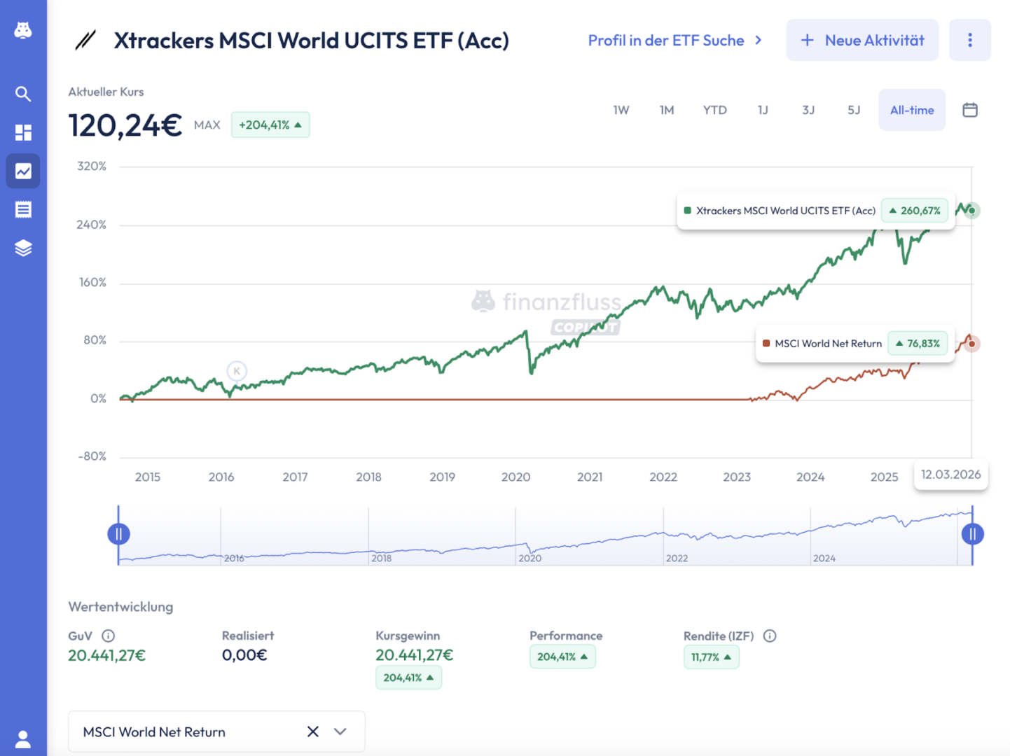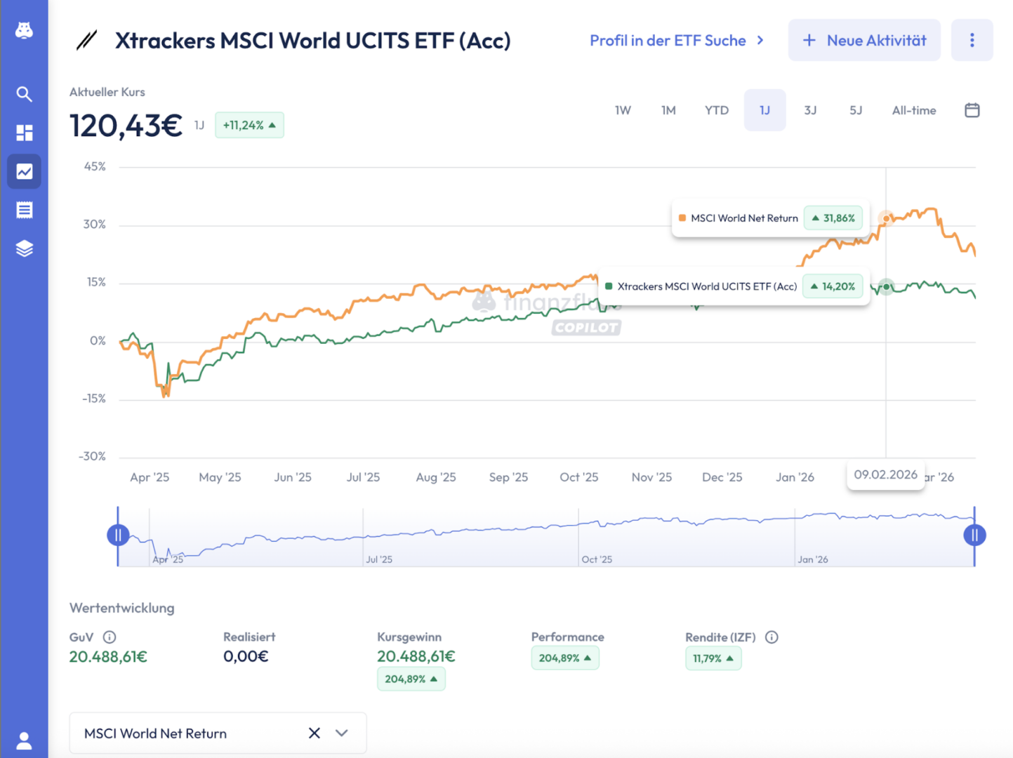 Damit ein Vergleich aussagekräftig ist, müssen beide Linien am selben Startpunkt beginnen. Das ist besonders wichtig, wenn du den Zeitraum auf „All-time" einstellst: In diesem Fall beginnt die Berechnung für jedes Asset zum frühestmöglichen Zeitpunkt, für den Daten vorliegen. Wenn dein ETF erst seit 2016 Daten liefert, eine andere Position in deinem Portfolio aber bereits seit 1999 gehalten wird, vergleichst du effektiv unterschiedlich lange Zeiträume miteinander – was die TWROR-Werte nicht mehr direkt vergleichbar macht.