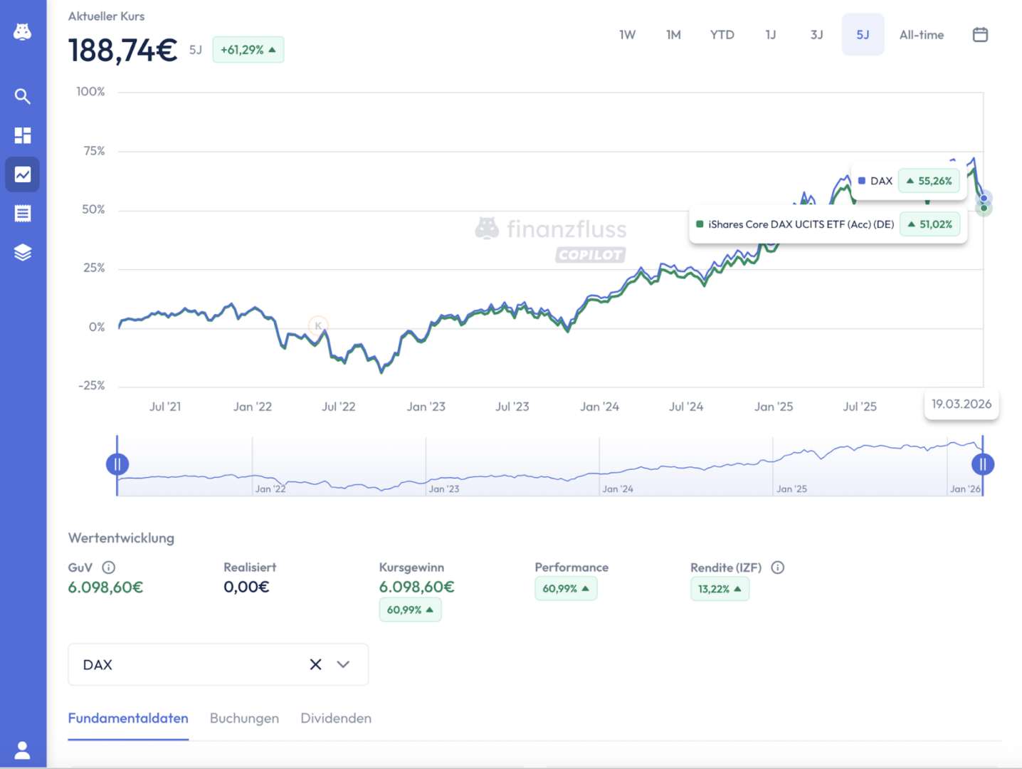 Unsere Empfehlung: Wähle immer den Zeitraum, den das „jüngste" Asset in deinem Vergleich abdeckt. Beispiel: Wenn dein DAX-ETF erst vor 3 Jahren aufgelegt wurde, solltest du den Zeitraum auf „3 Jahre" (oder manuell auf das Startdatum des ETFs) begrenzen. Nur so starten beide Linien zeitgleich bei 0% und du siehst, wer ab diesem Moment die bessere Rendite geliefert hat.