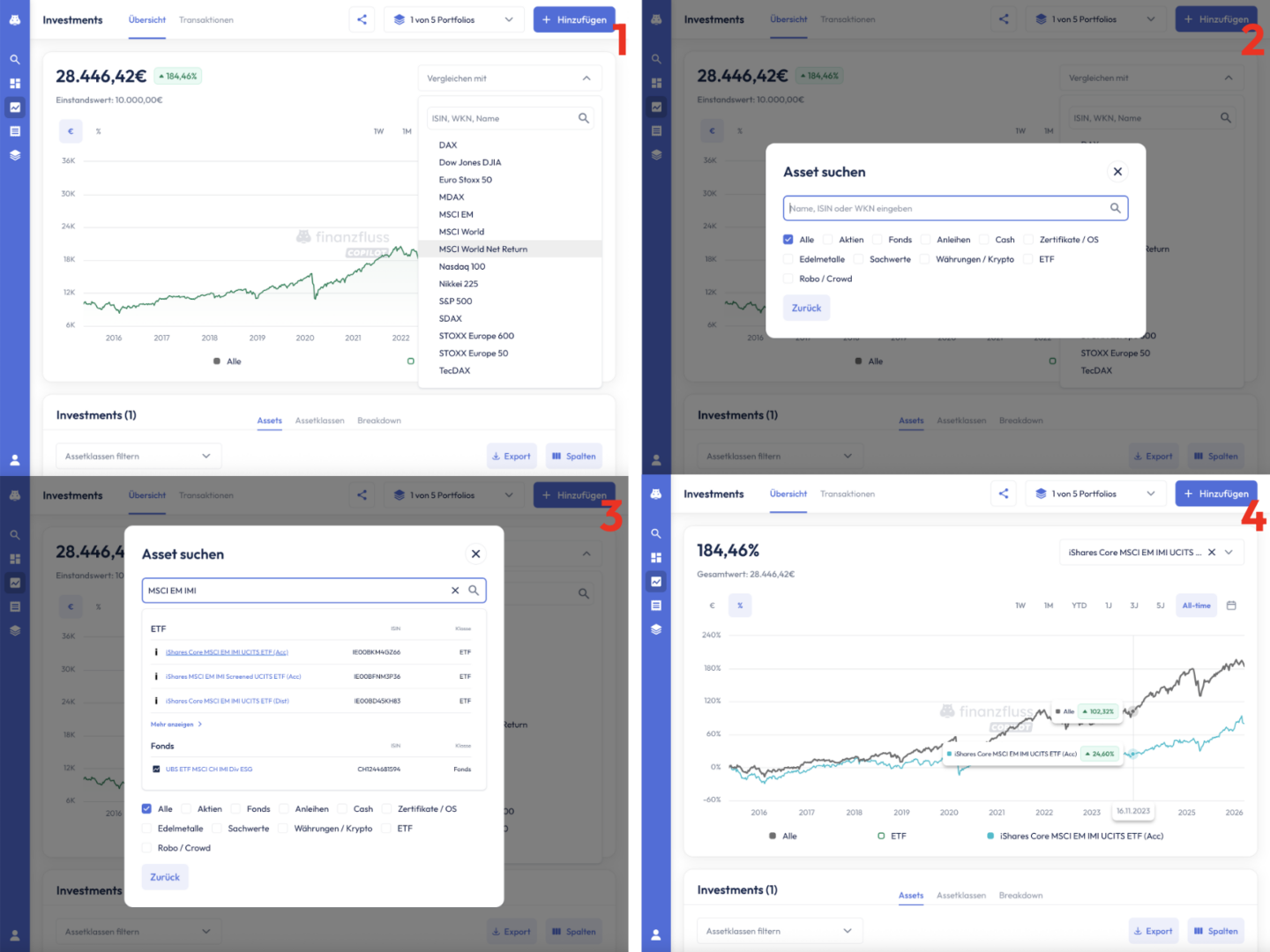 - Dashboard: Im Vermögens-Chart des Dashboards findest du den „Vergleichen mit"-Button in der oberen rechten Ecke des Graphen.