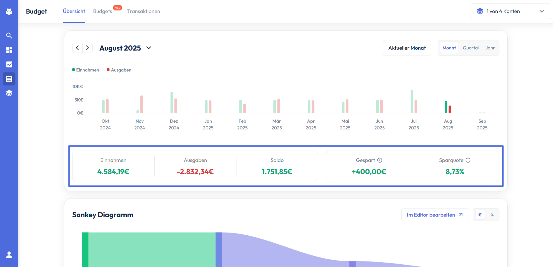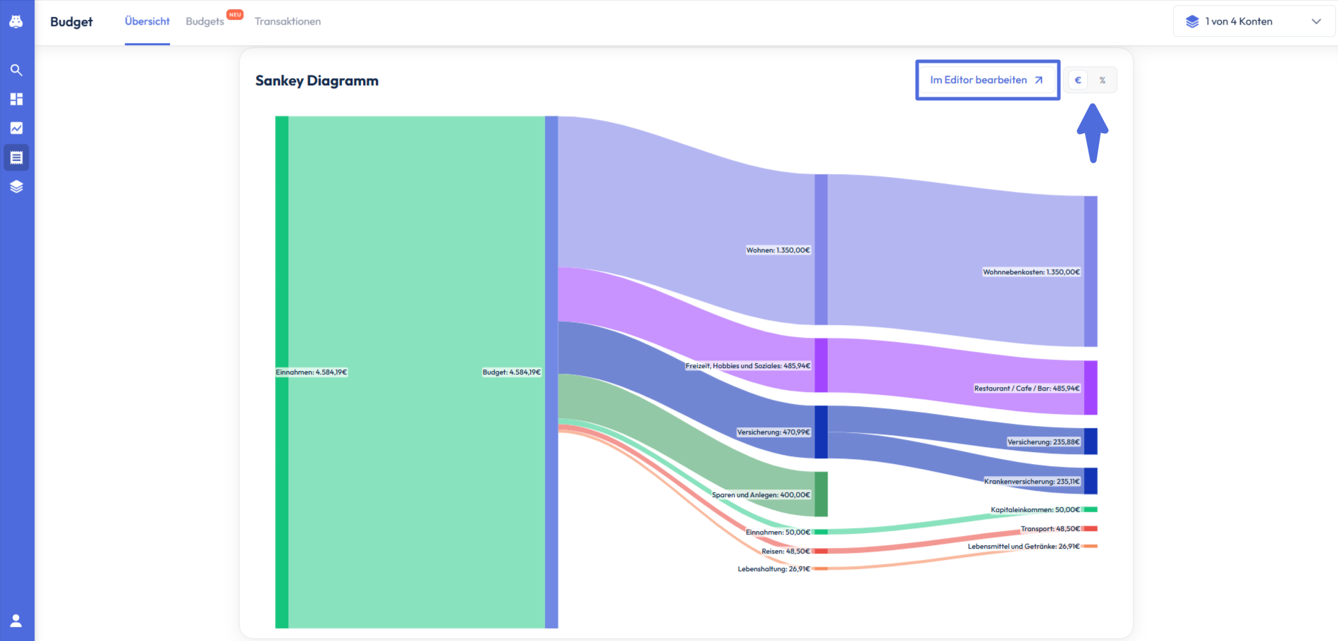 Unterhalb der Kennzahlen werden deine Einnahmen und Ausgaben nun in Form eines Sankey Diagramms dargestellt. Du kannst hier erkennen, aus welchen Quellen du wie viel Geld eingenommen hast und welche Beträge du in den verschiedenen Kategorien ausgegeben hast. Wenn du oben rechts auf % klickst, kannst du dir die einzelnen Kategorien auch in relativen Werten anzeigen lassen.