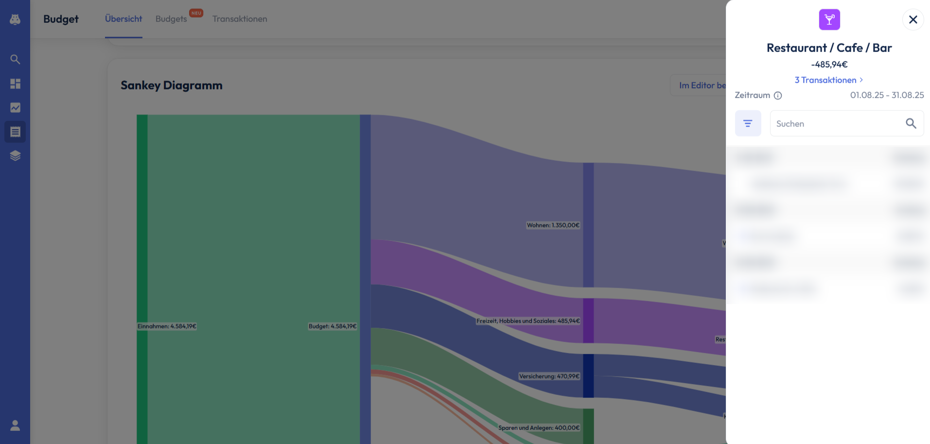 Wenn du nun erneut auf eine Kategorie in der Tabelle oder im Kreisdiagramm klickst, werden dir alle Transaktionen dieser Position, ähnlich wie auch beim Sankey Diagramm, auf der rechten Seite angezeigt.