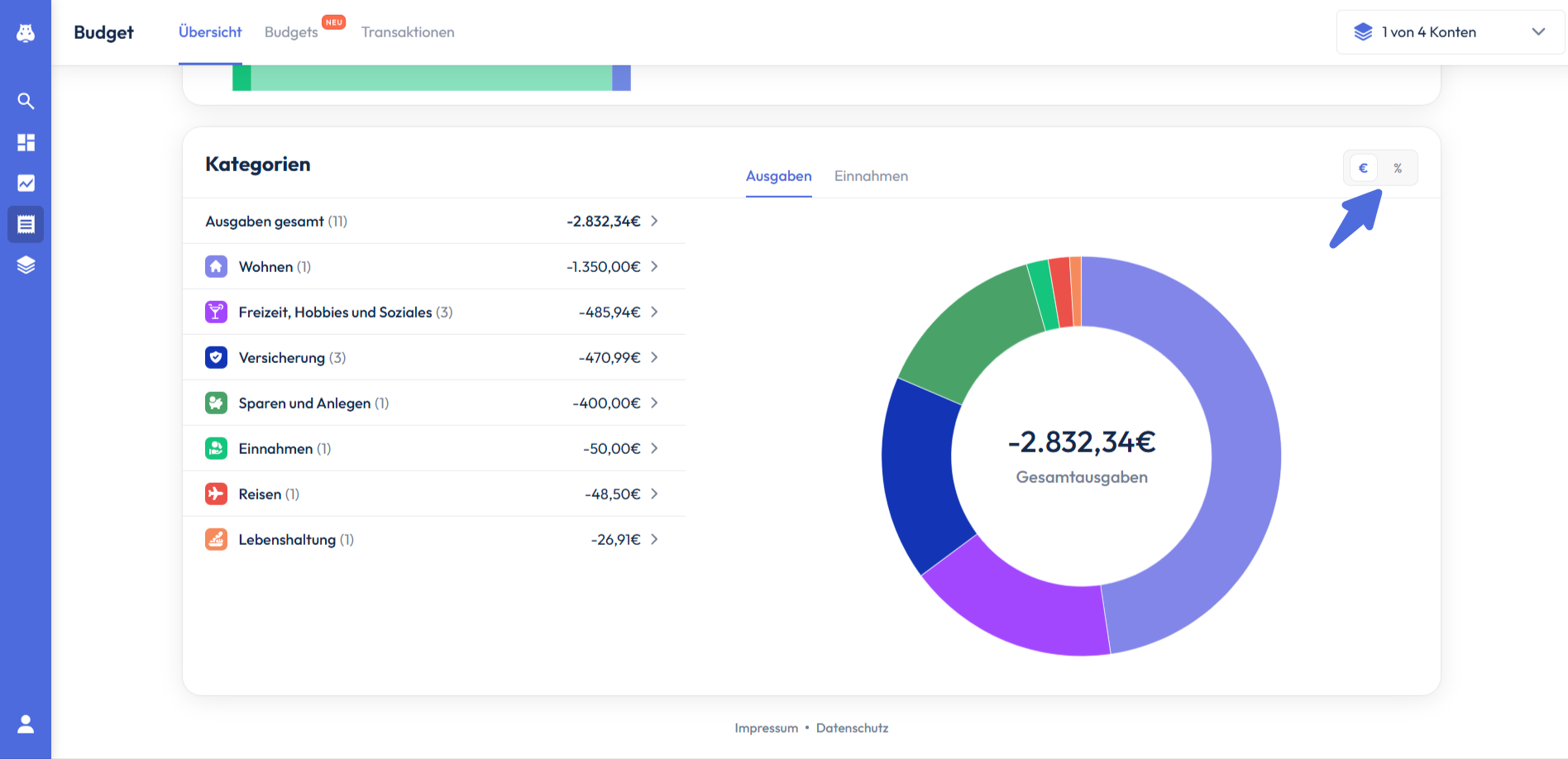 Unter dem Sankey Diagramm werden dir deine Einnahmen und Ausgaben nun getrennt in einem Kreisdiagramm angezeigt. Auch hier kannst du wieder die Darstellung von absoluten zu relativen Werten ändern, indem du oben rechts auf % klickst.