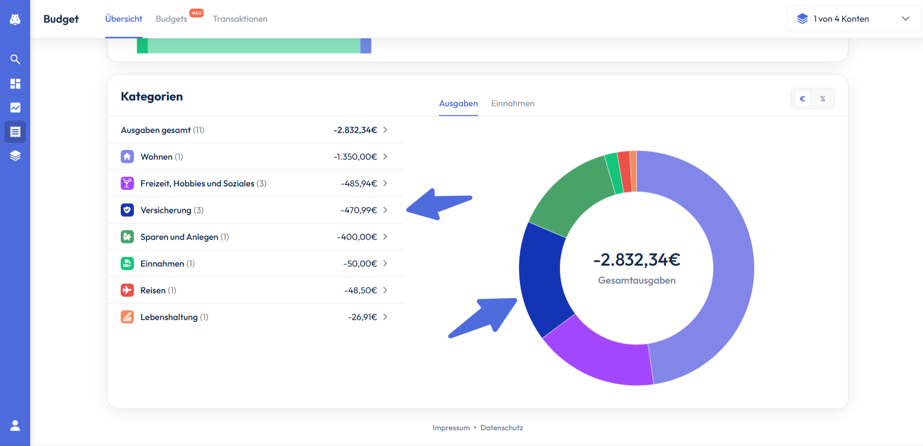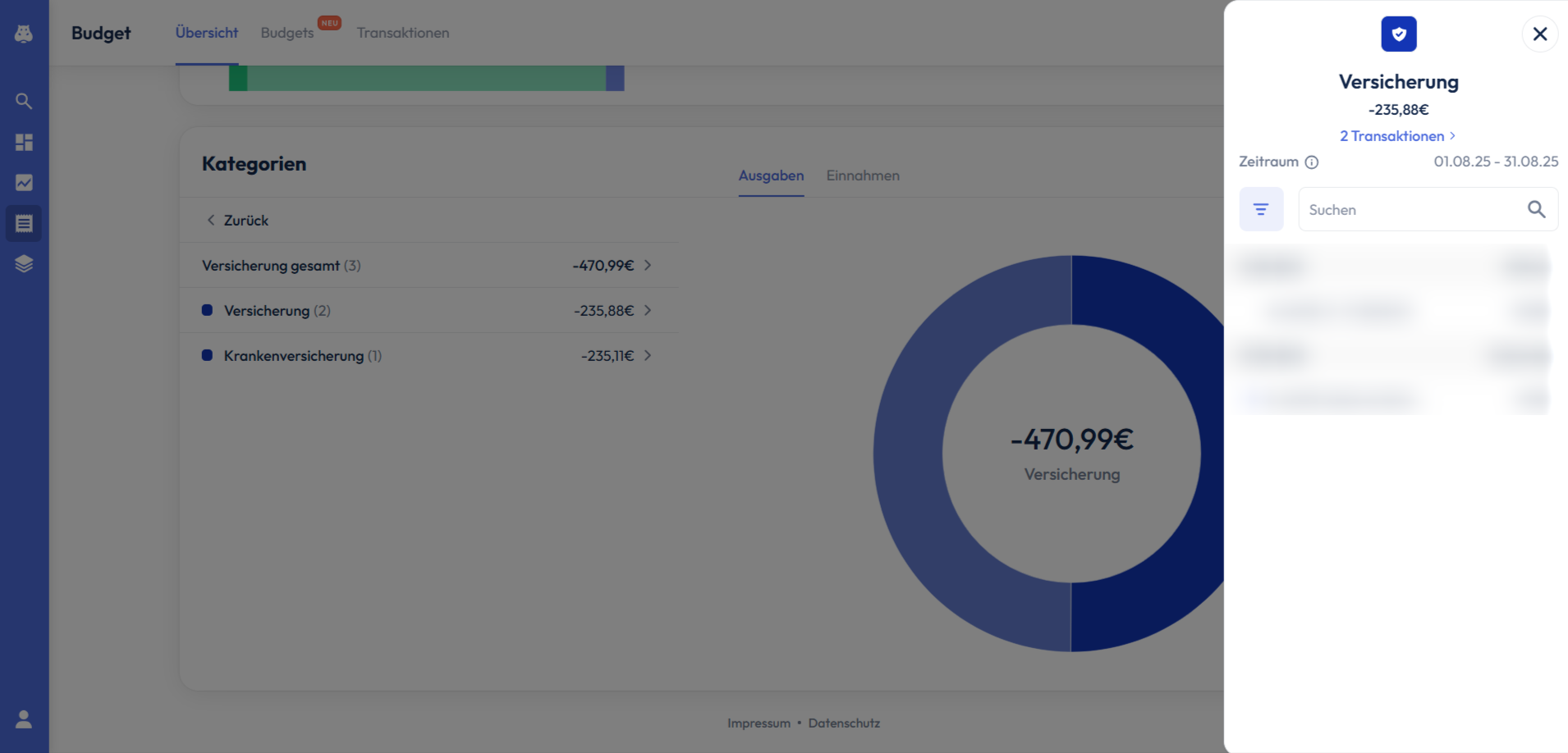Wenn du auf eine bestimmte Kategorie klickst, werden dir auf der rechten Seite alle Transaktionen angezeigt, die der entsprechenden Kategorie zugeordnet werden.