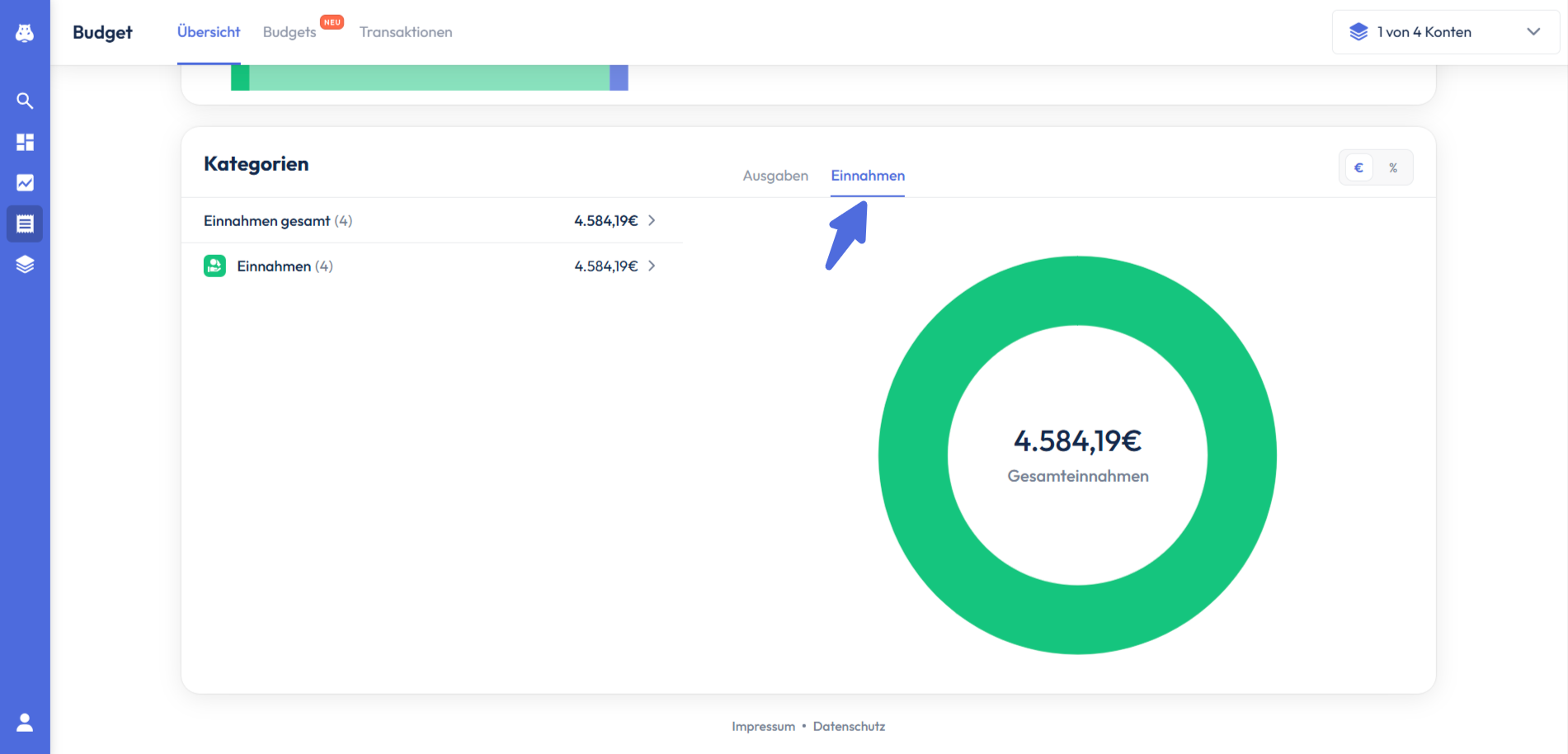 Wenn du auf Einnahmen klickst, werden diese dir ebenfalls nach dem gleichen Prinzip und mit den gleichen Funktionen in einem Kreisdiagramm angezeigt.