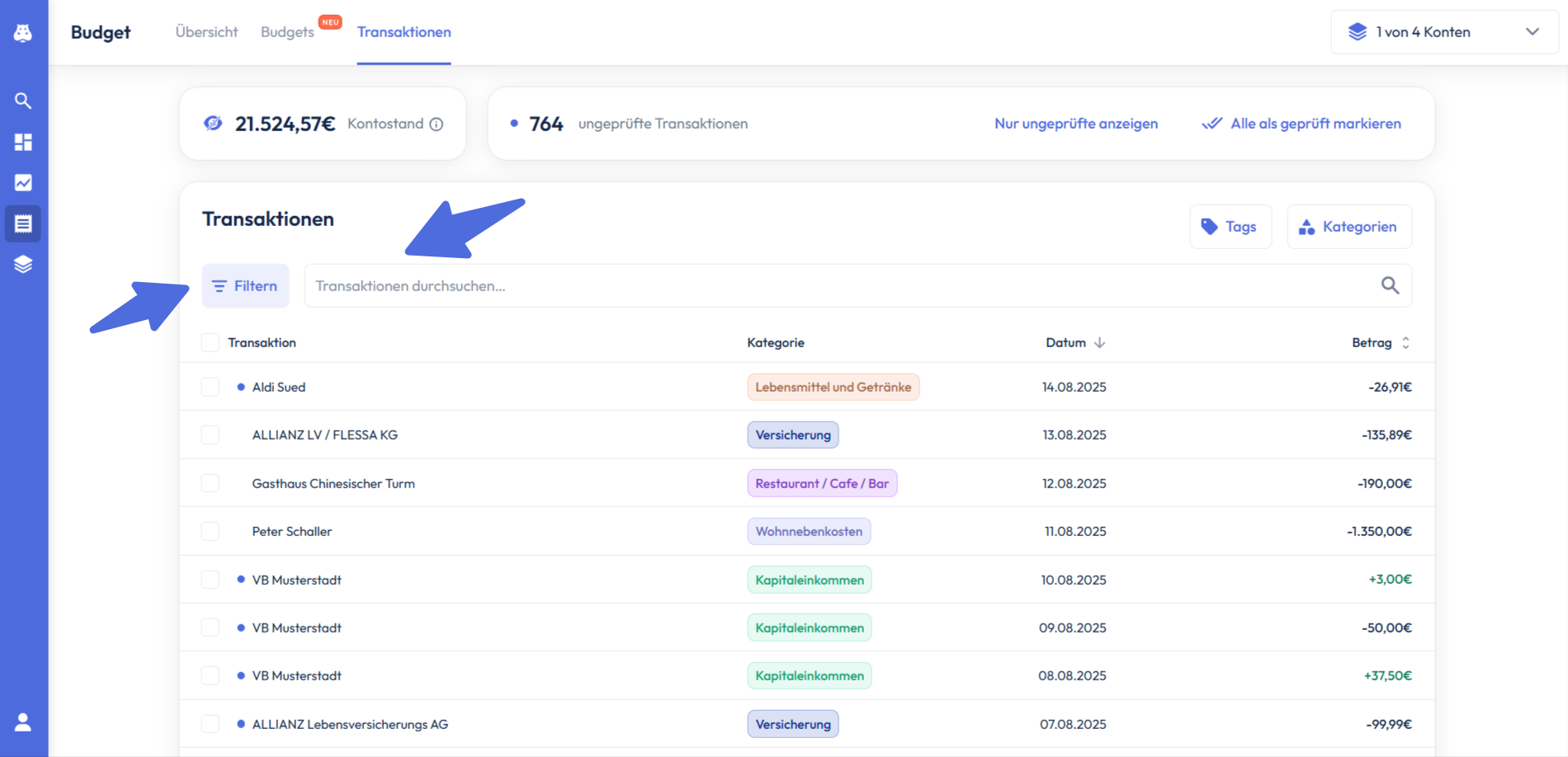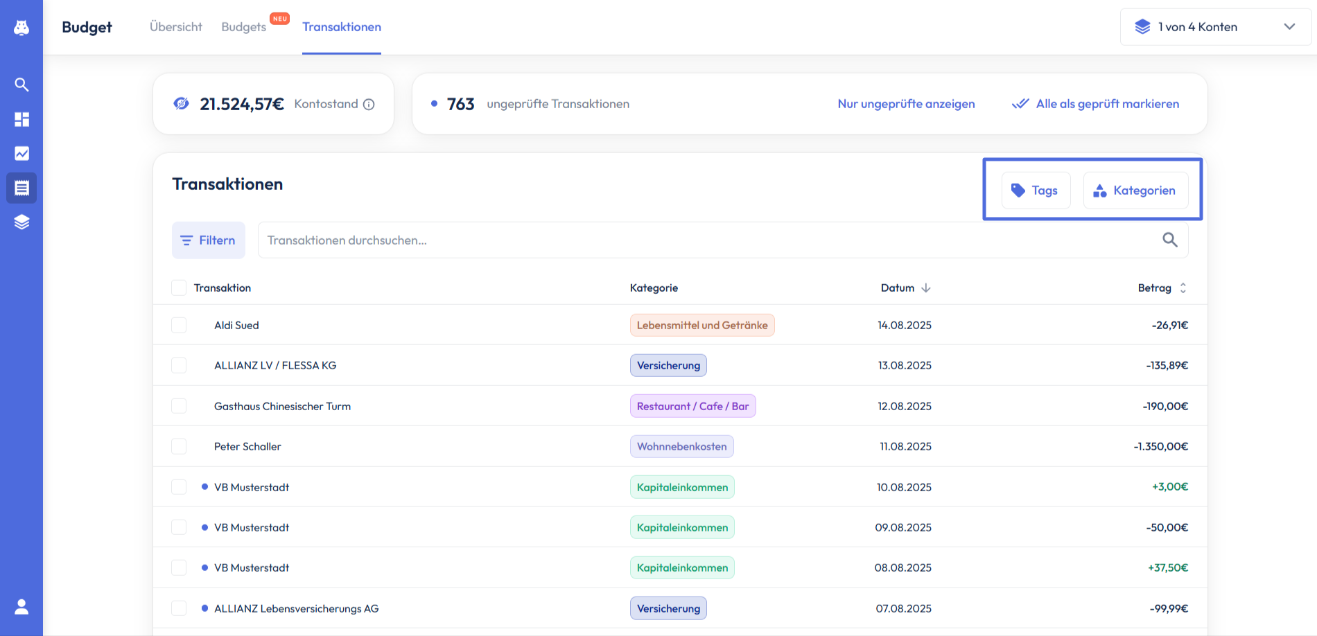 Indem du Tags hinzufügst, kannst du deine Transaktionen ebenfalls sowohl textbasiert, als auch farblich kennzeichnen und so eine weitere Filterfunktion erstellen. Näheres zu Tags erfährst du hier.