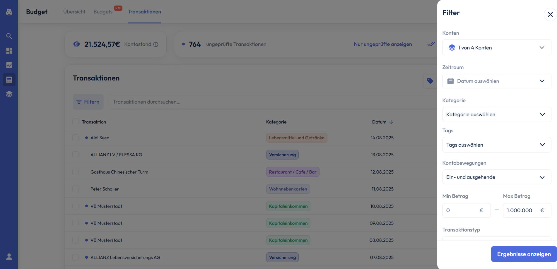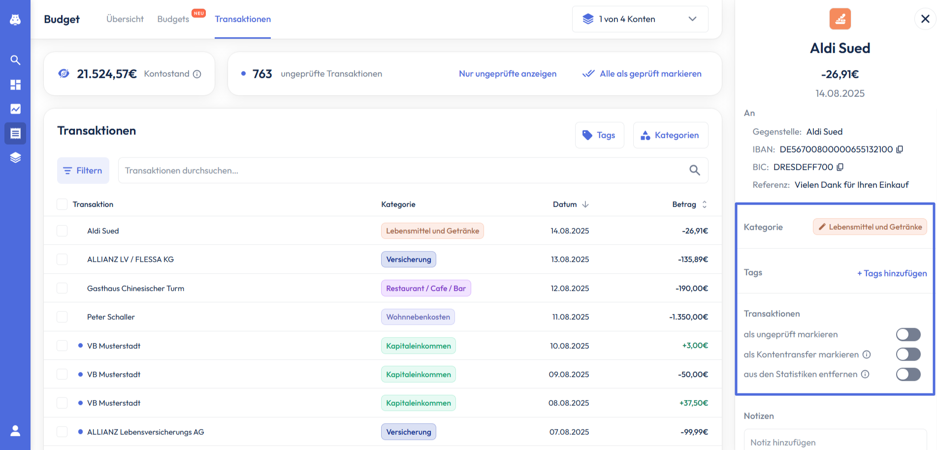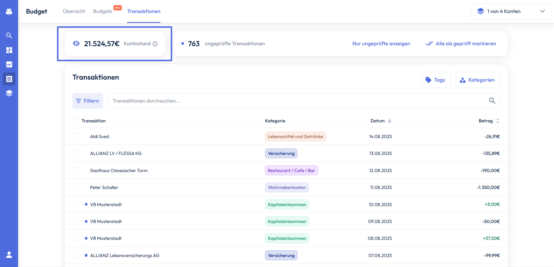 Im Bereich Transaktionen siehst du zusätzlich zu allen Transaktionen deinen Kontostand und die Anzahl ungeprüfter Transaktionen deiner zuvor ausgewählten Konten.