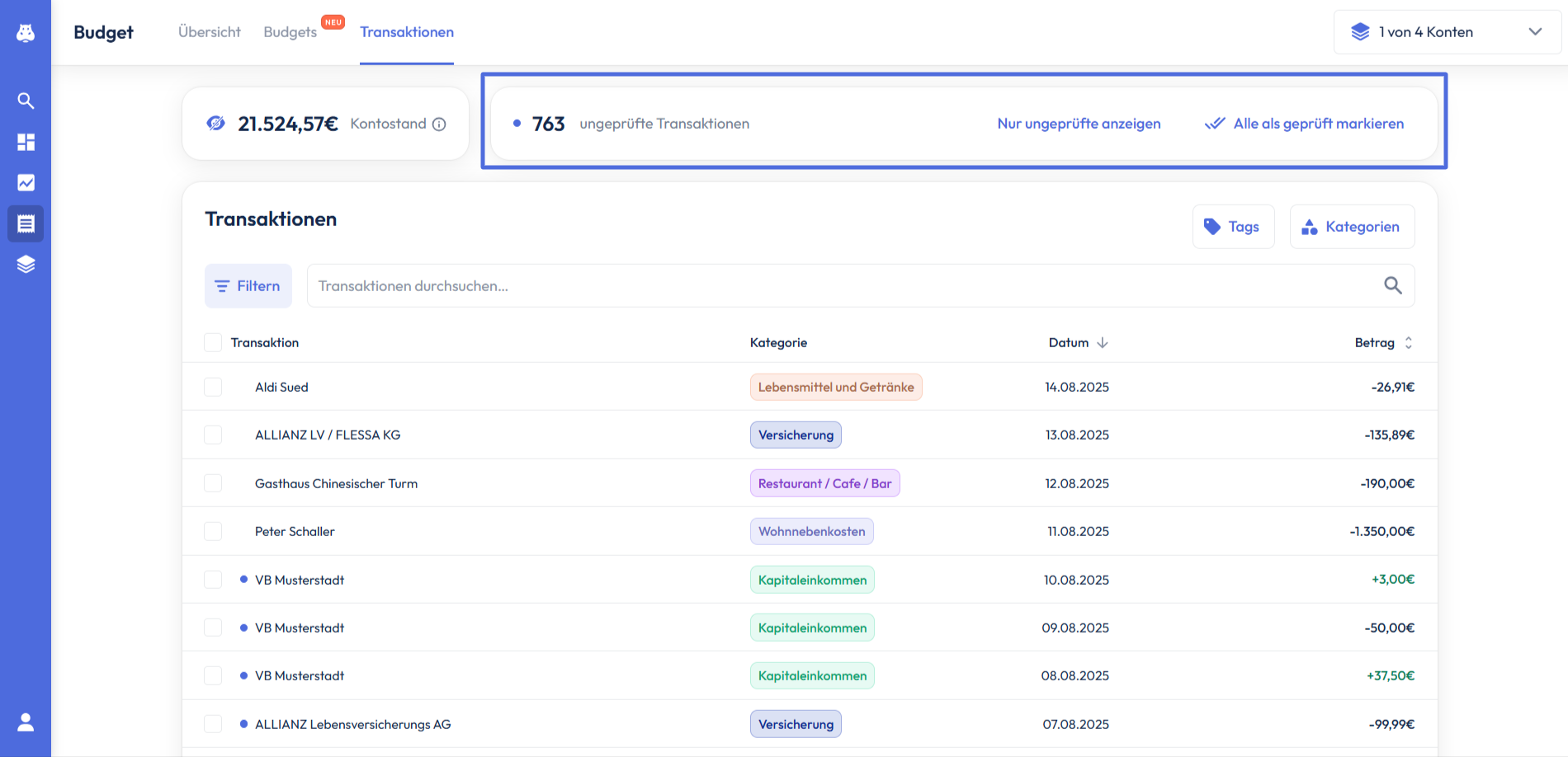 Wir teilen deine Transaktionen automatisch den verschiedenen Kategorien zu. Da der automatisierte Zuordnungsprozess fehlerhaft sein kann, bietet es sich an, die Transaktionen manuell zu überprüfen. Wenn dir keine Unstimmigkeiten auffallen und du mit der Zuordnung aller Transaktionen zufrieden bist, kannst du hier alle ungeprüften Transaktionen auf einmal als geprüft markieren.