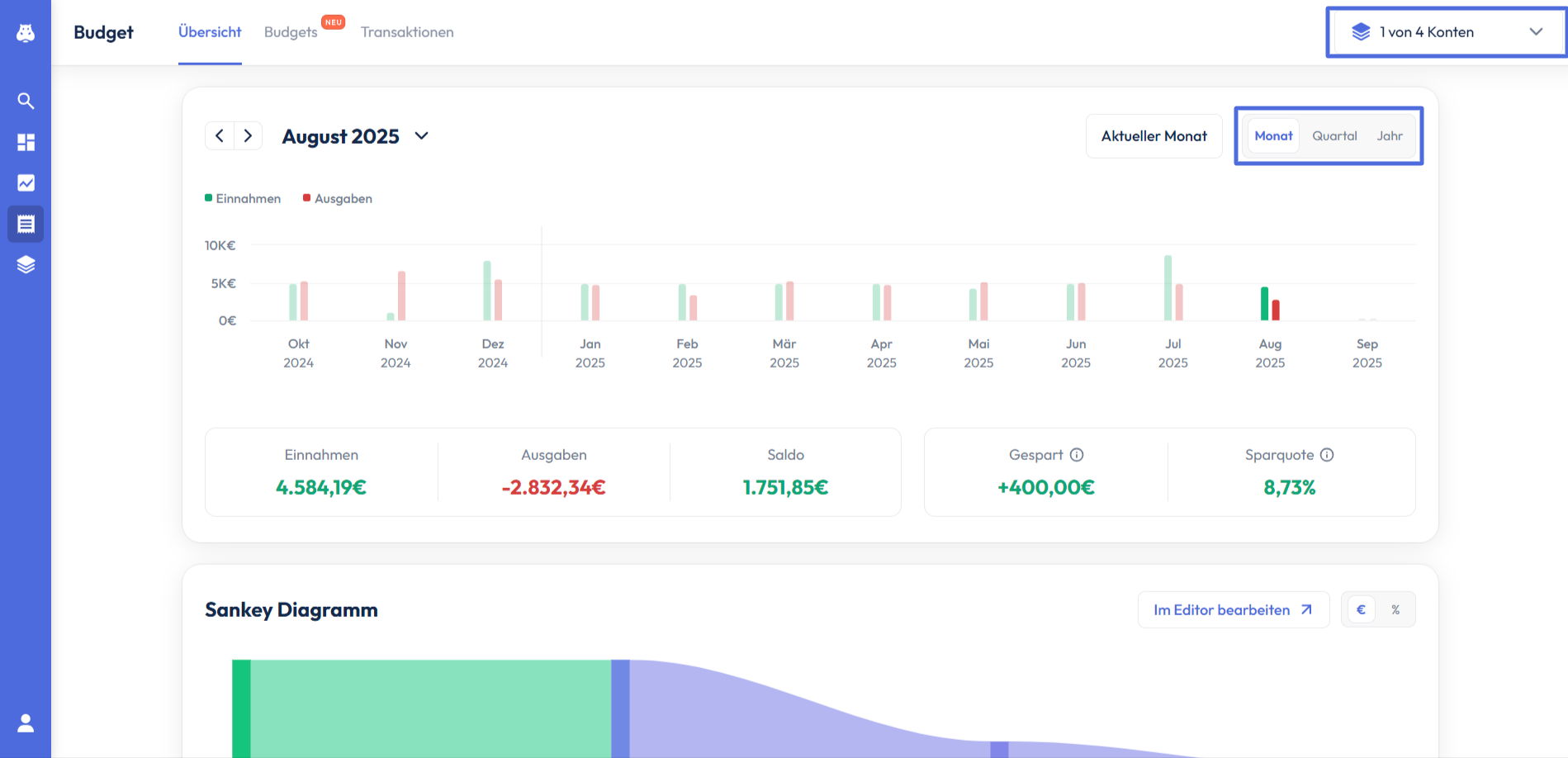 Im Bereich Insights siehst du zunächst einen Überblick über deine Einnahmen und Ausgaben der letzten zwölf Monate. Du kannst die Zeitintervalle ändern, indem du oben rechts auf “Quartal” oder “Jahr” gehst. Dadrüber kannst du die Konten auswählen, dessen Transaktionen du mit einbeziehen möchtest.