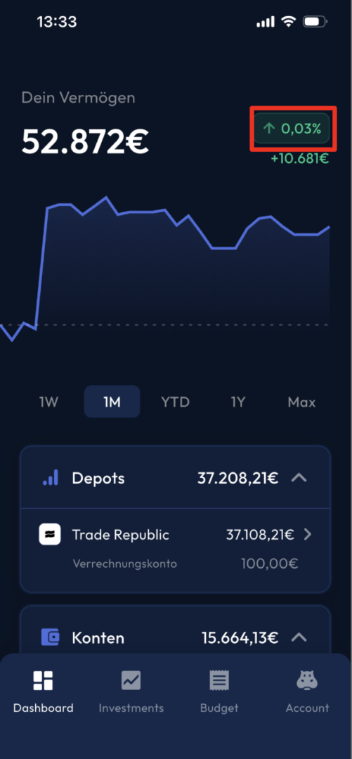 Sobald du mit dem Finger auf eine beliebige Stelle des Graphen drückst, erscheint ein Schieberegler. Dieser zeigt dir – je nach gewähltem Zeitraum – deine Vermögensentwicklung in 1-Tages- oder 7-Tages-Schritten an. In diesem Modus ändern sich die beiden Zahlen oben rechts: Sie zeigen dir nun die relative und absolute Wertentwicklung deines Vermögens innerhalb des ausgewählten Zeitraums.