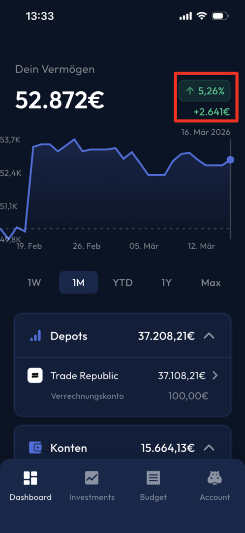 Beispiel: Du wählst den Zeitraum „1 Monat". Dein aktuelles Vermögen beträgt 52.872 € und zu Beginn des Monats waren es 50.232 €. Wenn du den Schieberegler ganz nach rechts auf den heutigen Tag ziehst, wird dir eine Veränderung von +5,26 % sowie der dazugehörige absolute Betrag von ca. 2.641 € angezeigt. Das bedeutet also für dich, dass dein Vermögen innerhalb des letzten Monats um 2.532€ (5.15%) gewachsen ist.