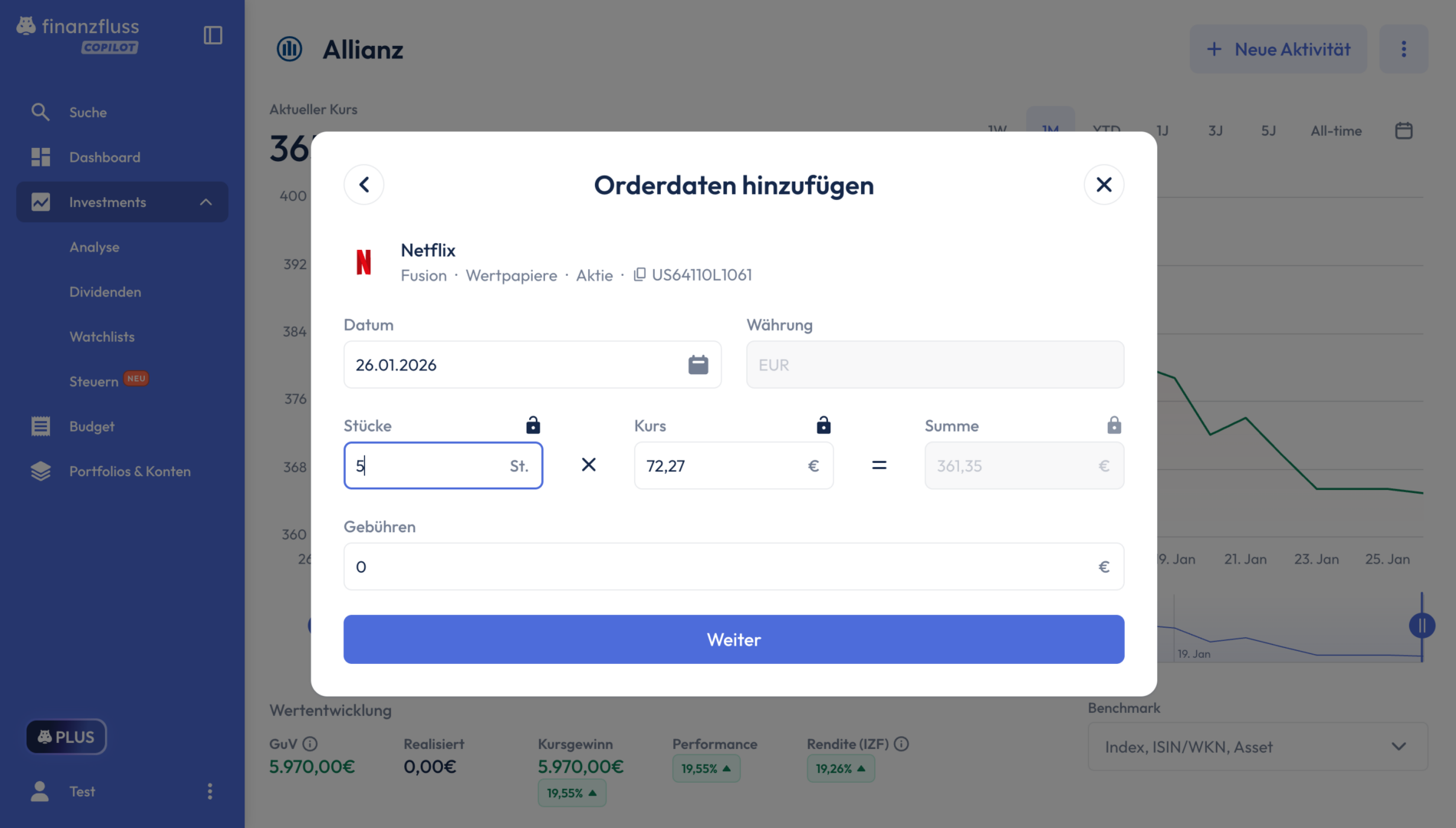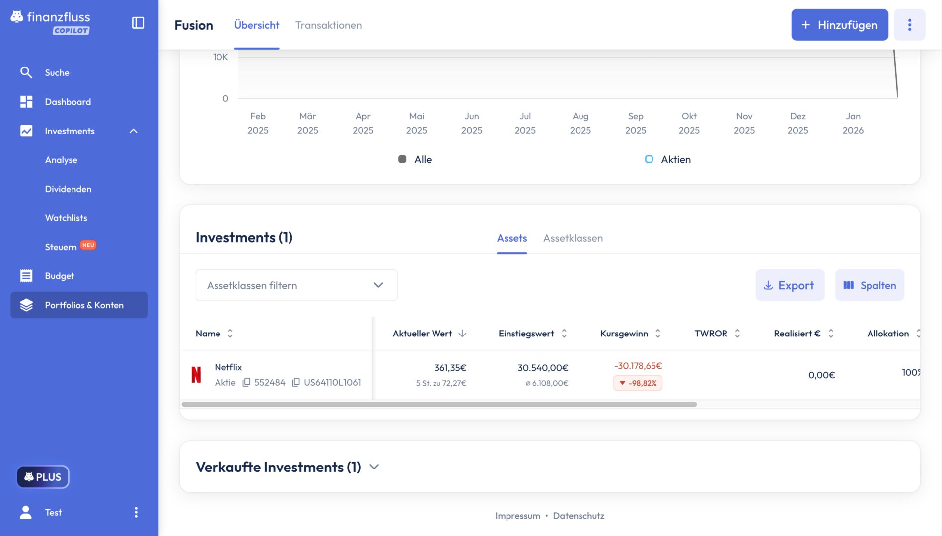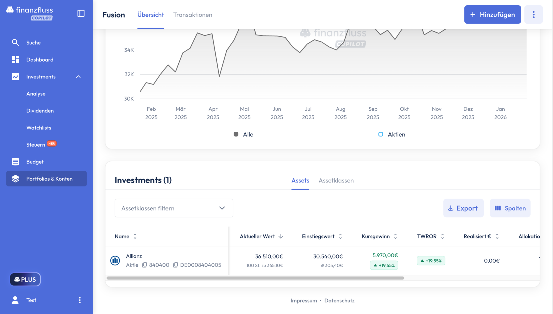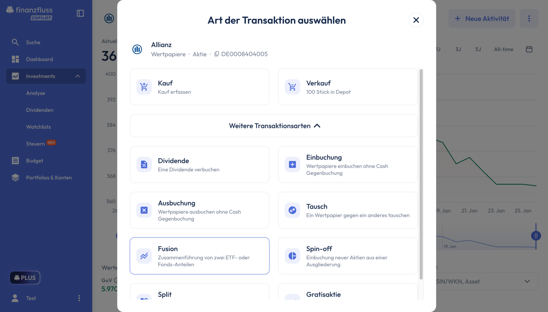 Navigiere im Copilot zum Bereich „Investments" in der Sidebar und klicke das betroffene Wertpapier an, oder wähle unter „Portfolios & Konten" das betroffene Konto und darin das Wertpapier aus. Dort findest du oben rechts den Button „Hinzufügen". Klicke darauf und wähle aus dem Dropdown-Menü die Option „Fusion" aus.