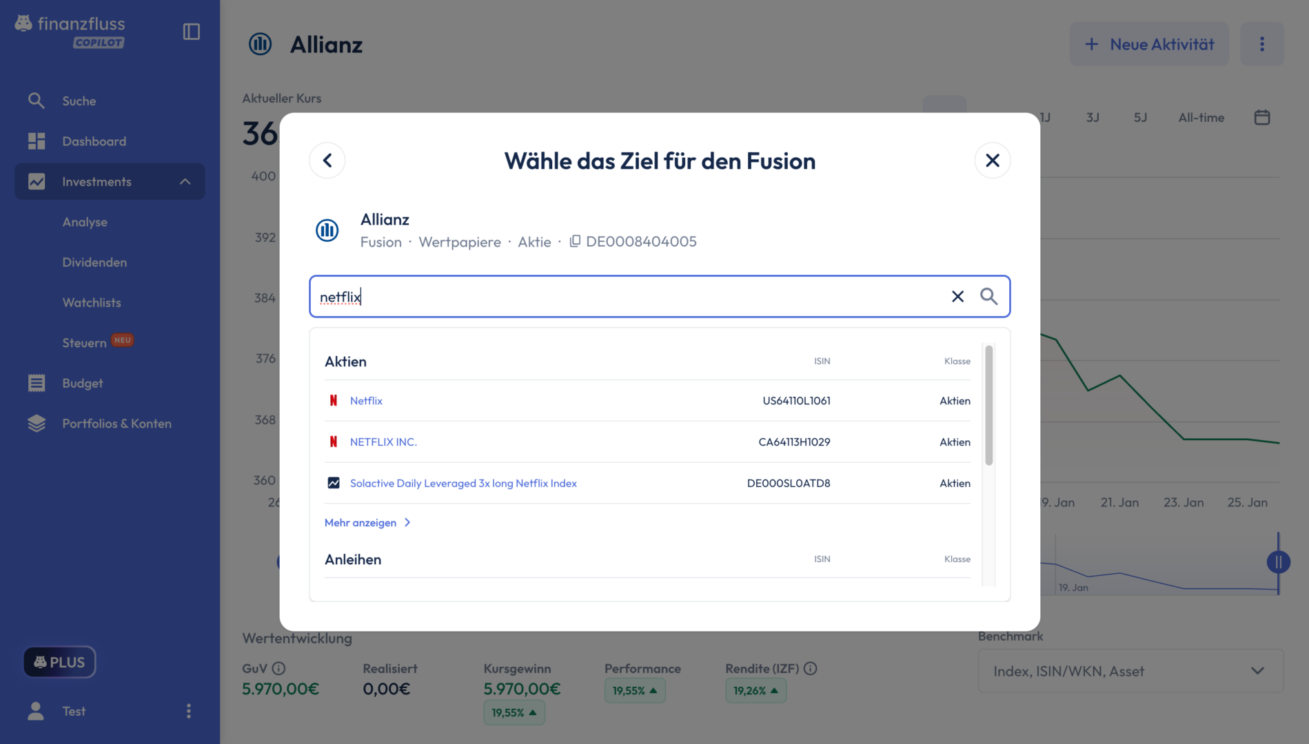 Um diese Veränderung in deinem Portfolio korrekt abzubilden, musst du die Fusion im Copilot eintragen. Dadurch werden deine ursprünglichen Anteile ausgebucht und die neuen Anteile eingebucht, sodass deine Performance-Berechnung und Portfolio-Übersicht weiterhin korrekt sind.