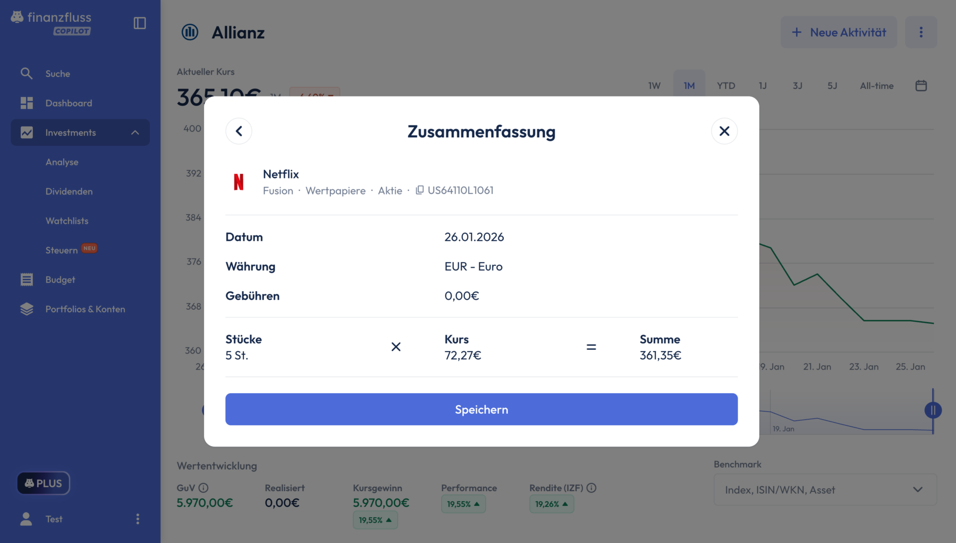 Überprüfe alle eingegebenen Daten noch einmal sorgfältig und klicke dann auf „Speichern" oder „Hinzufügen". Die Fusion wird nun in deinem Portfolio verarbeitet, und die alten Anteile werden gegen die neuen Anteile ausgetauscht.