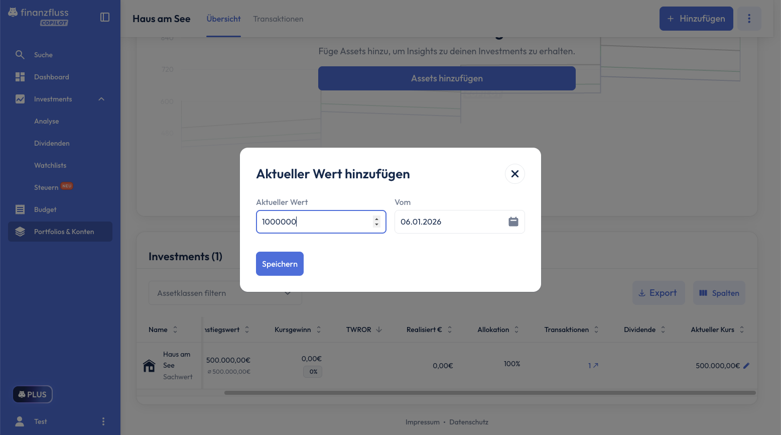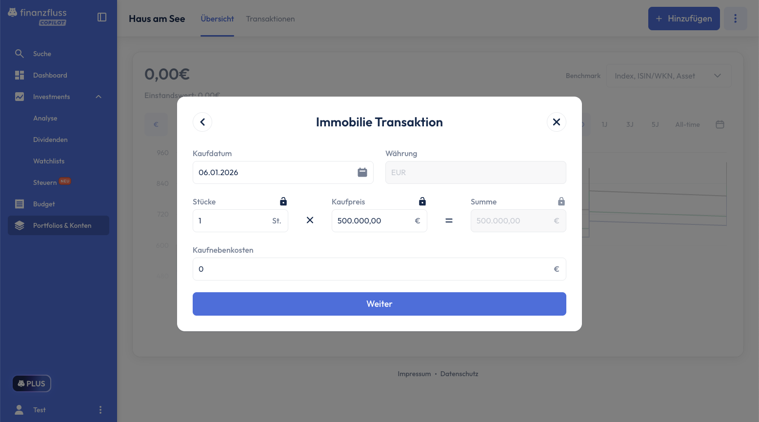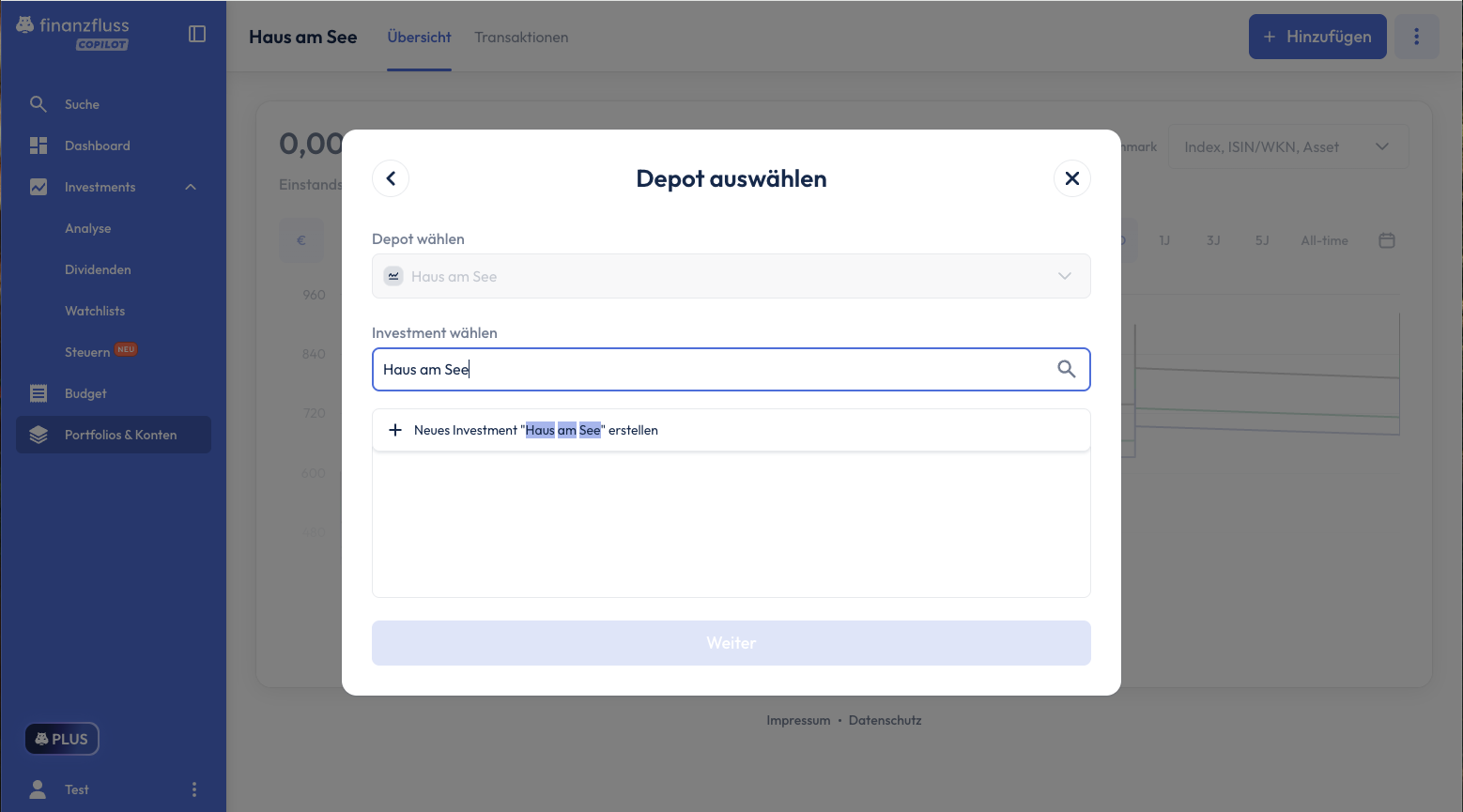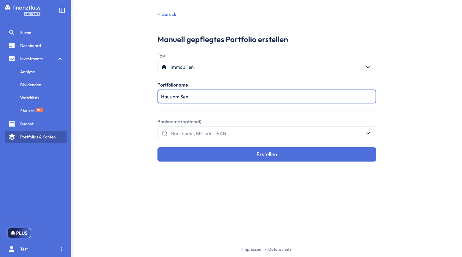 Um ein Immobilien-Portfolio anzulegen, gehst du im Bereich „Portfolios & Konten" auf „+ Hinzufügen". Wähle dort die Kategorie „Immobilien" aus. Anschließend gibst du deinem Portfolio einen Namen – zum Beispiel „Haus am See". Sobald du auf „Erstellen" klickst, wird das Portfolio direkt in deiner Übersicht angezeigt.