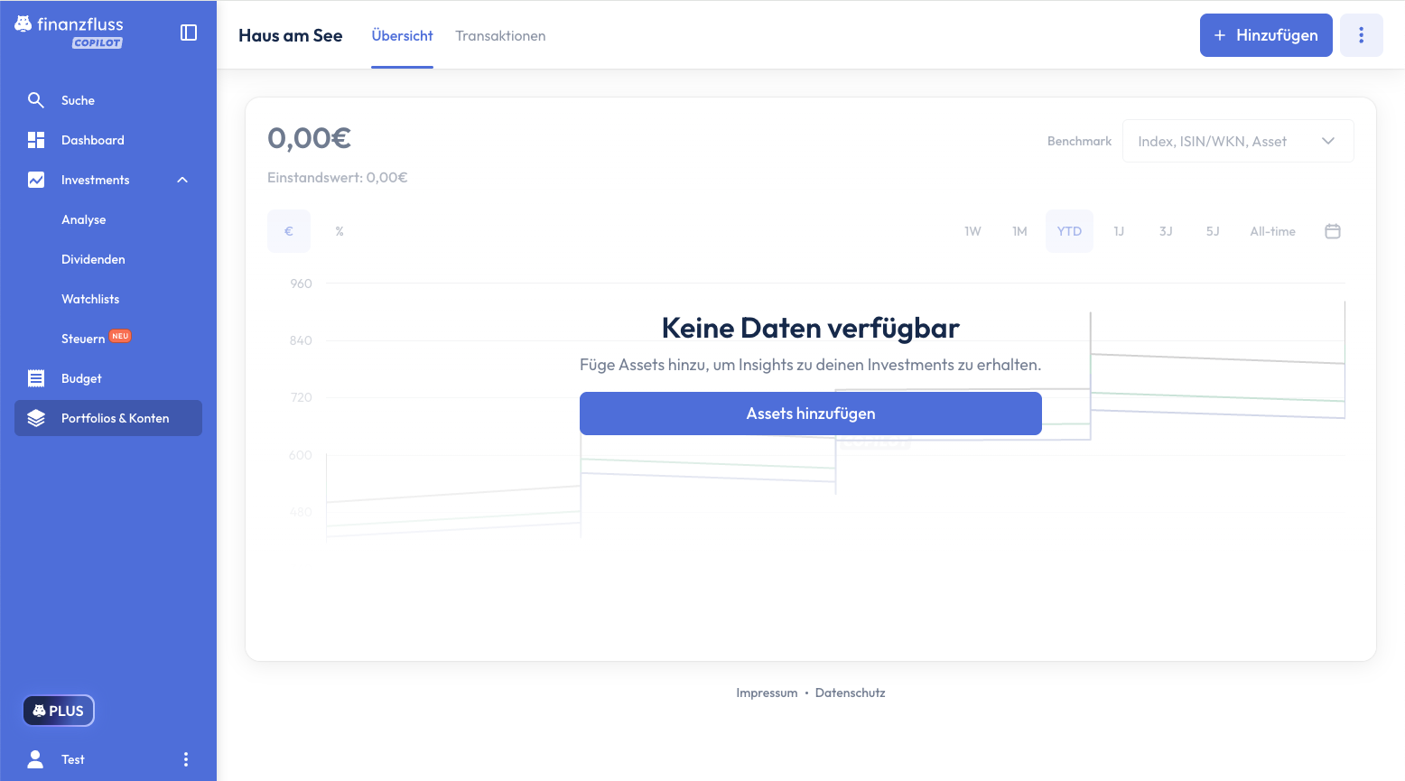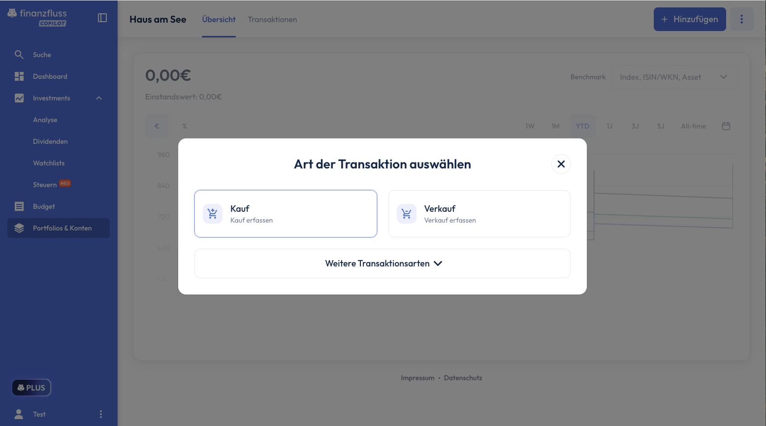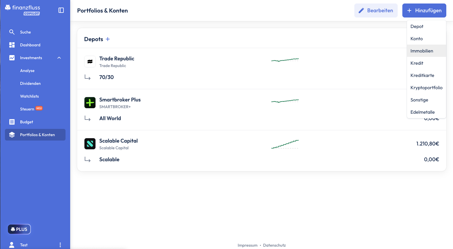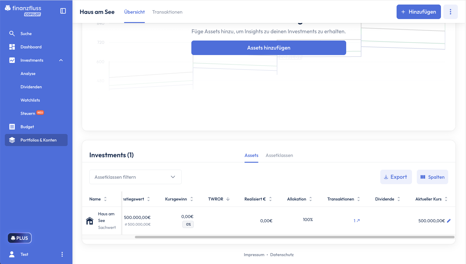 Um ein Immobilien-Portfolio anzulegen, gehst du im Bereich „Portfolios & Konten" auf „+ Hinzufügen". Wähle dort die Kategorie „Immobilien" aus. Anschließend gibst du deinem Portfolio einen Namen – zum Beispiel „Haus am See". Sobald du auf „Erstellen" klickst, wird das Portfolio direkt in deiner Übersicht angezeigt.