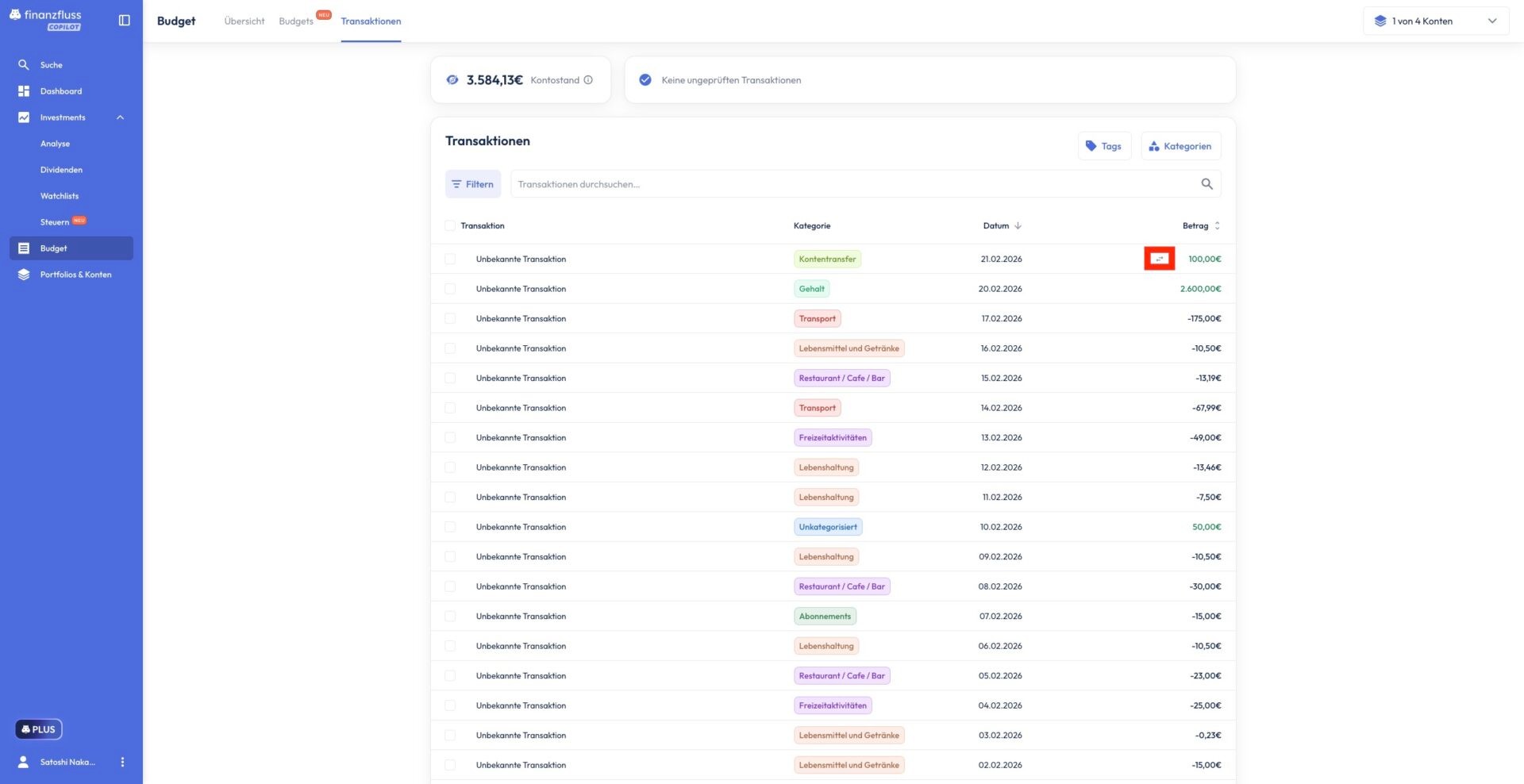 Diese Markierung wird dir sowohl im Transaktionen-Tab des Budgets angezeigt als auch in der Buchungstabelle des Kontos, in dem die Transaktion stattgefunden hat.