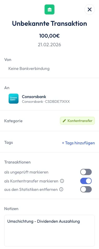 - Kontentransfer: Die Buchung bleibt als neutraler Buchungssatz sichtbar. Das ist wichtig für die Vollständigkeit deiner Kontenhistorie und wird weiterhin in der Cash Balance berücksichtigt.