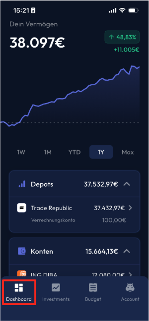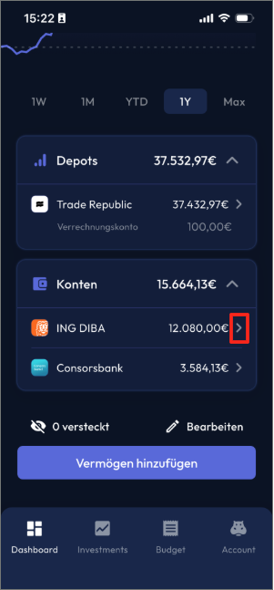 Die Konten- und Depots-Cards werden direkt unterhalb des Vermögens-Charts angezeigt. Standardmäßig ist die Kontenkarte bereits ausgeklappt, sodass alle deine Konten auf einen Blick aufgelistet sind.