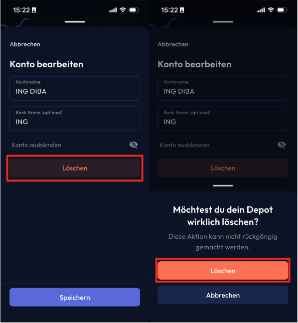 Konto/Depot löschen: Mobile App