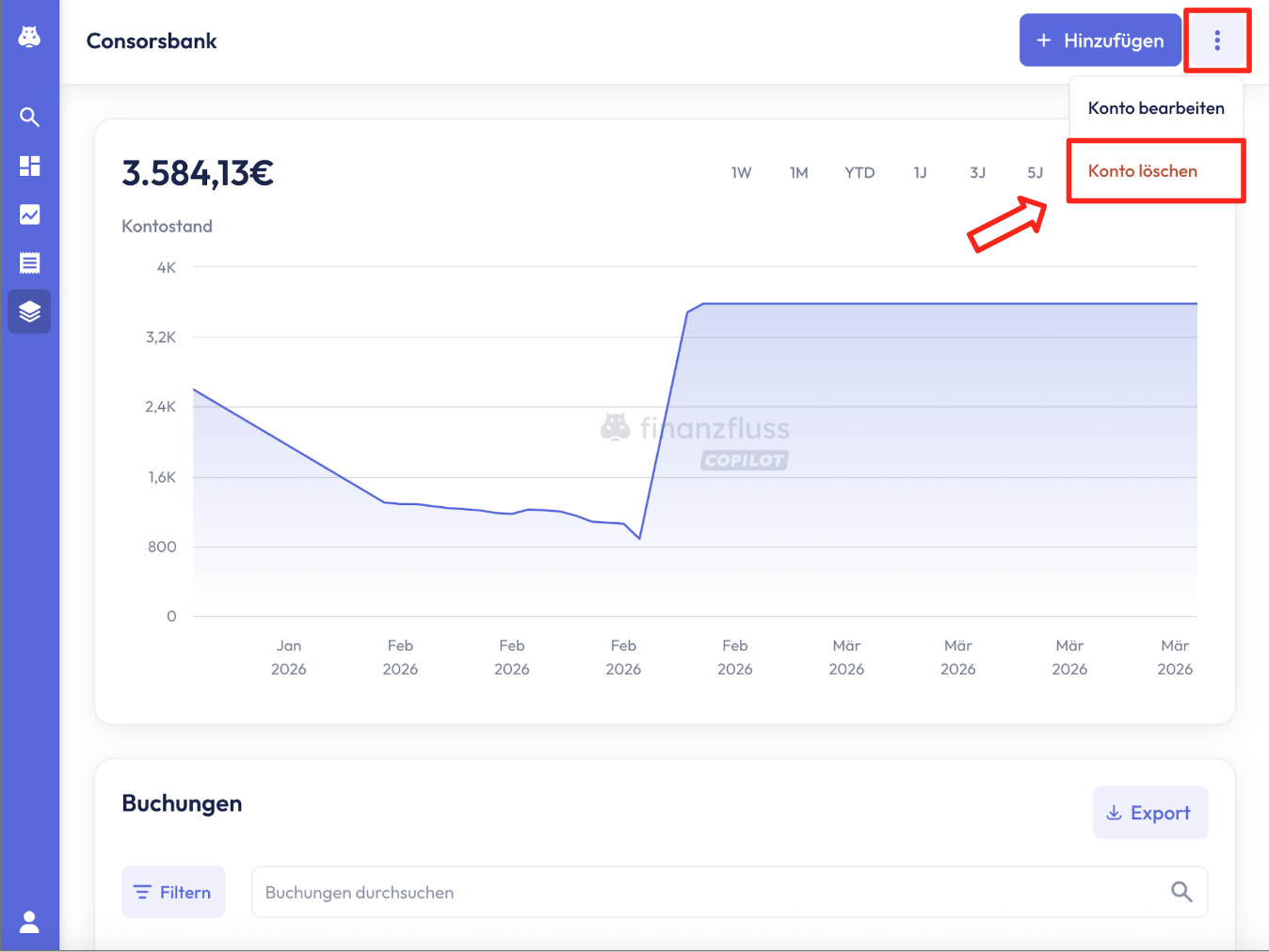- Konto/Depot löschen: Das Konto wird vollständig und dauerhaft aus dem Copilot entfernt – einschließlich aller bisher importierten Transaktionen. Es ist anschließend nicht mehr im Copilot sichtbar, kann aber jederzeit neu hinzugefügt werden.