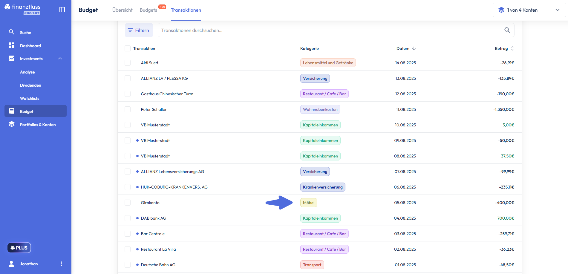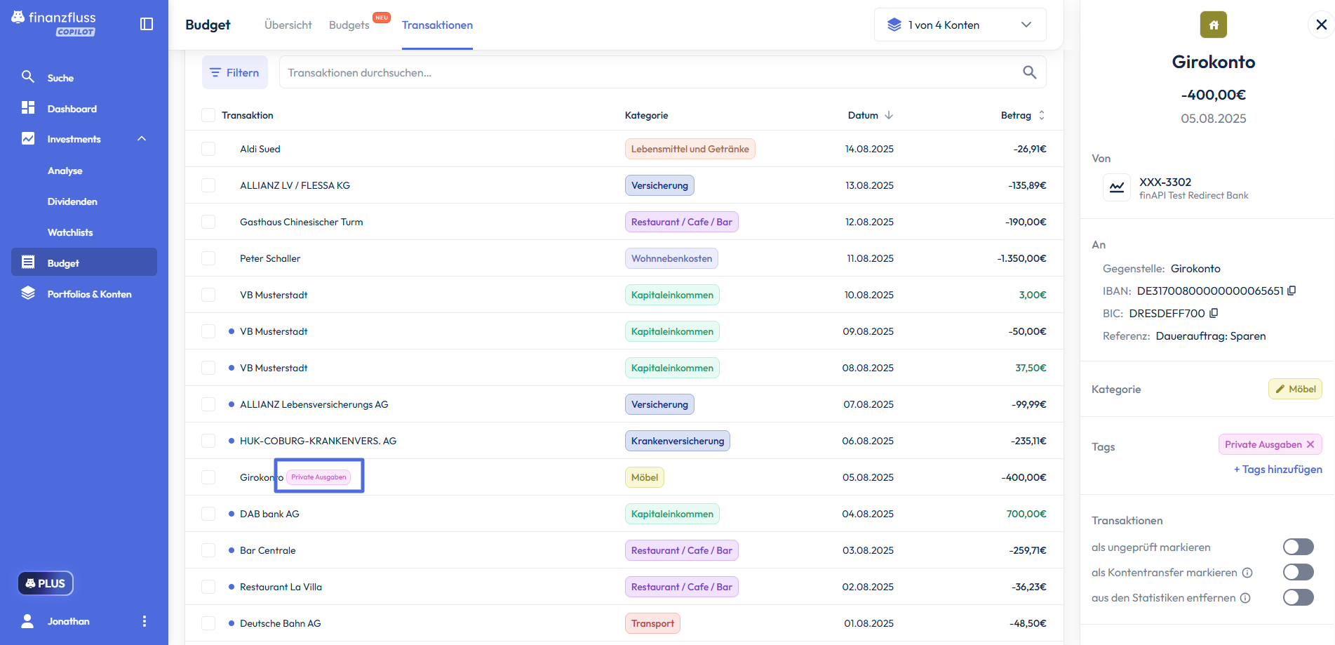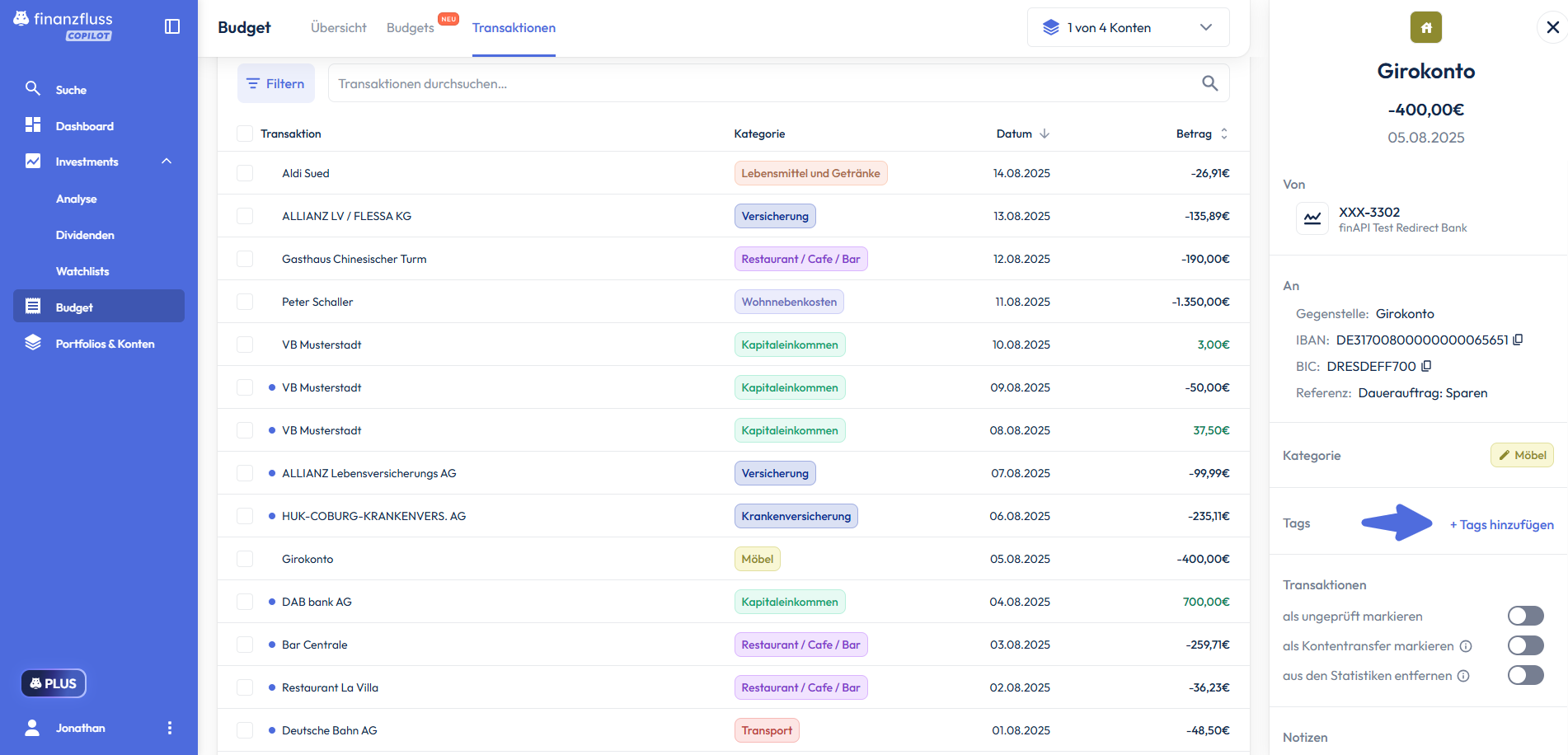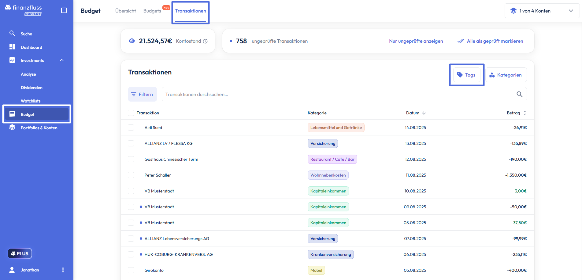 Indem du unter Transaktionen auf die jeweilige Ausgabe klickst, kannst du sie nun mit deinem erstellten Tag kennzeichnen.