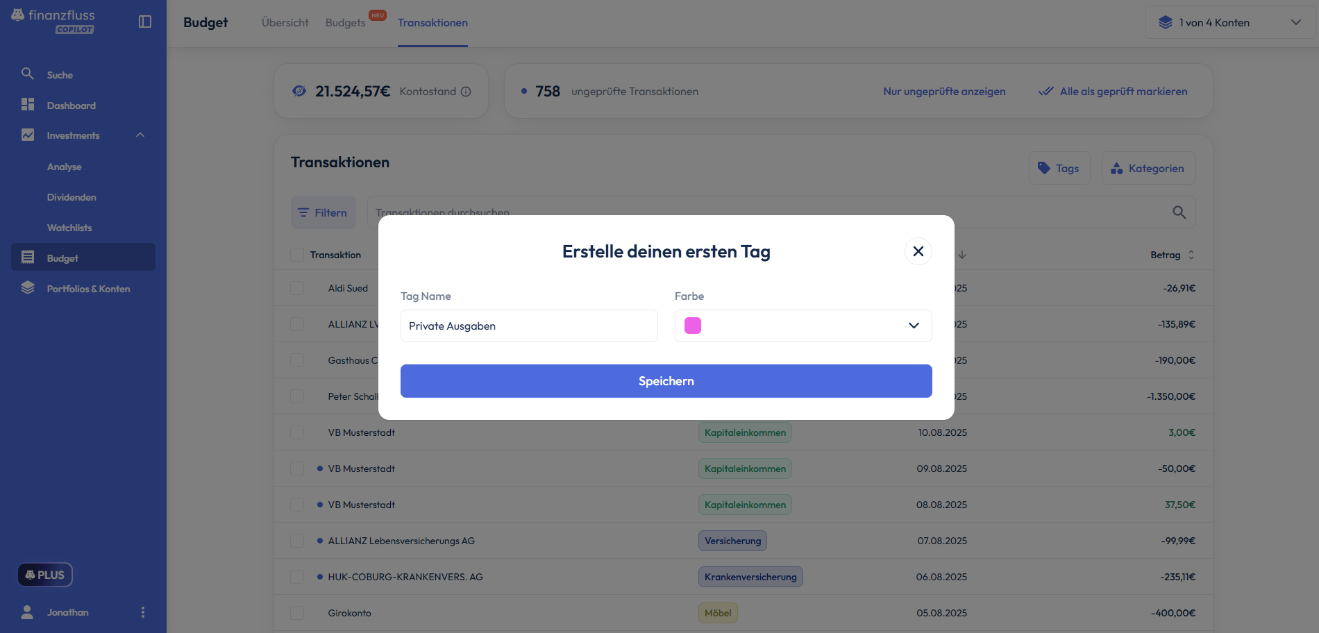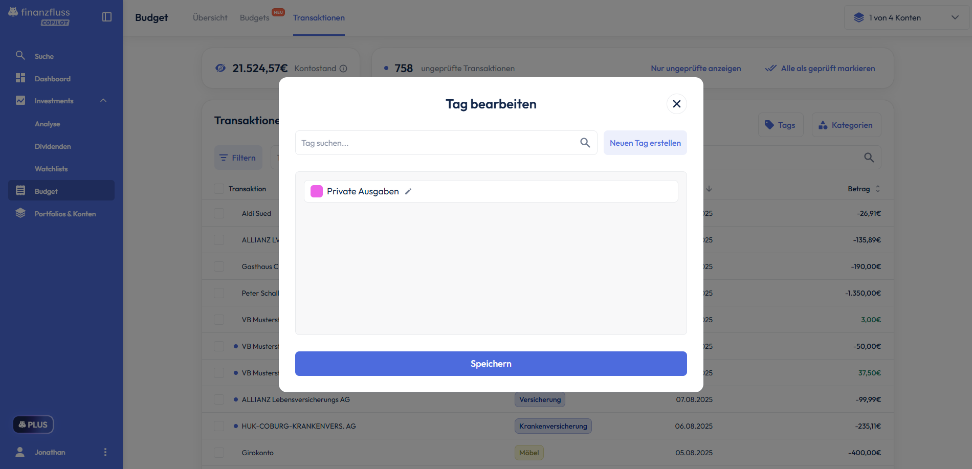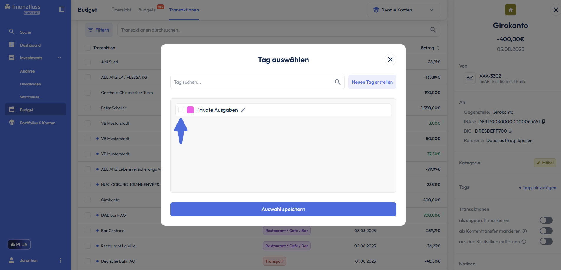Wir wollen in diesem Beispiel unsere privaten Ausgaben kennzeichnen und erstellen deshalb den Tag “Private Ausgaben”.