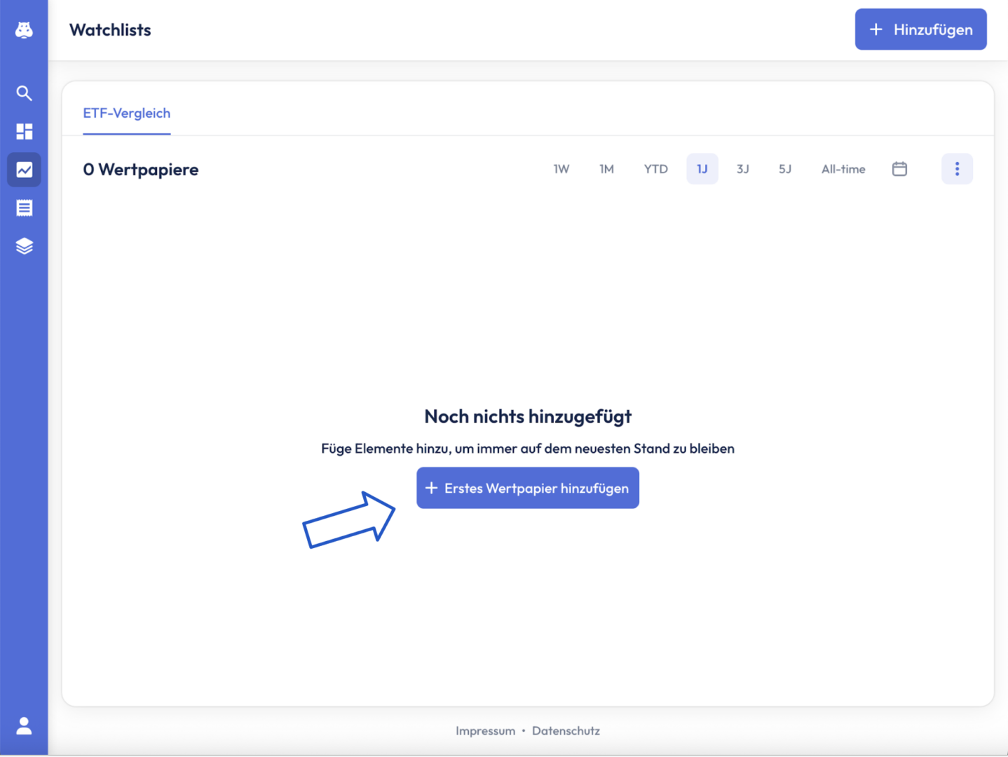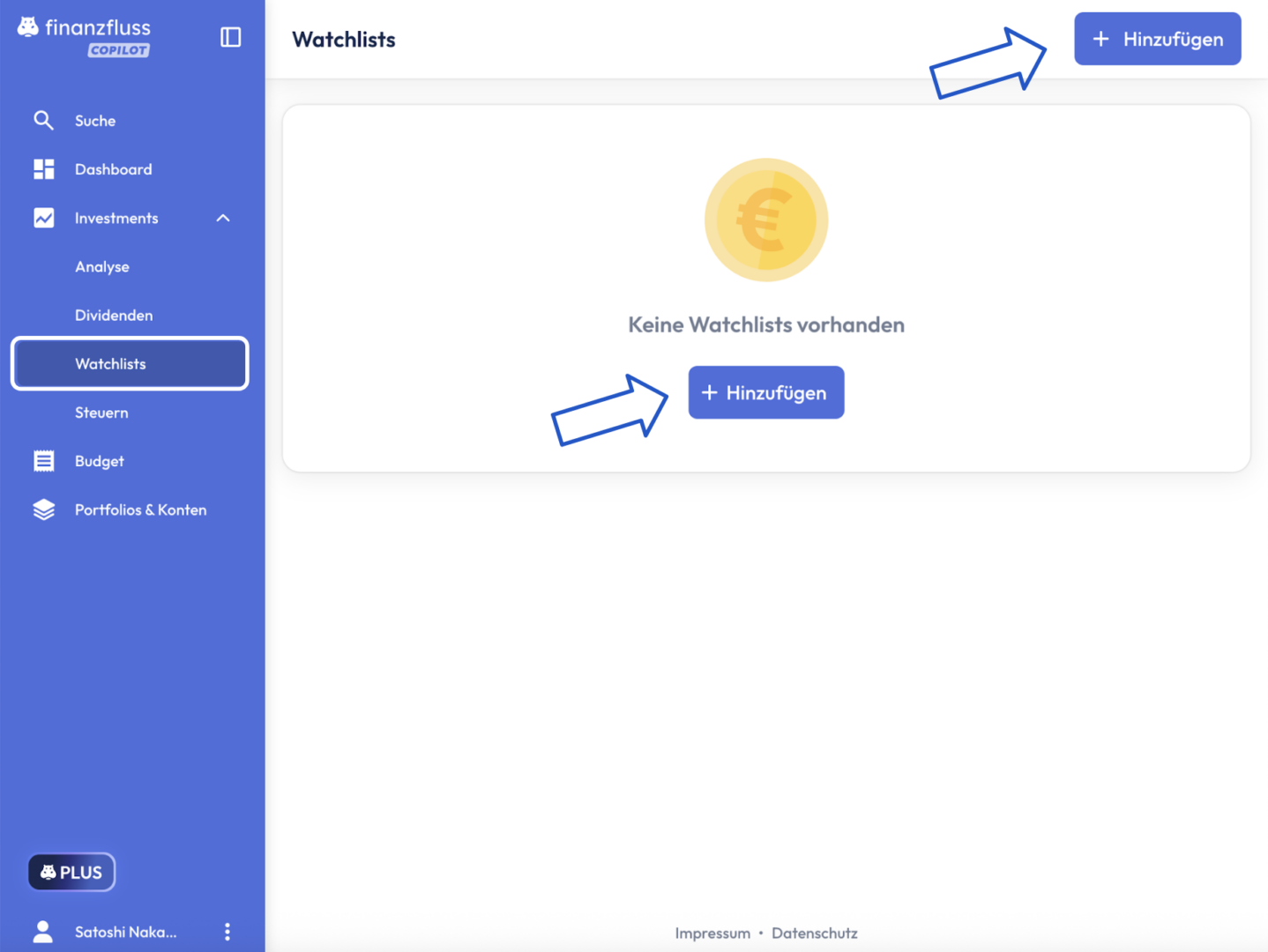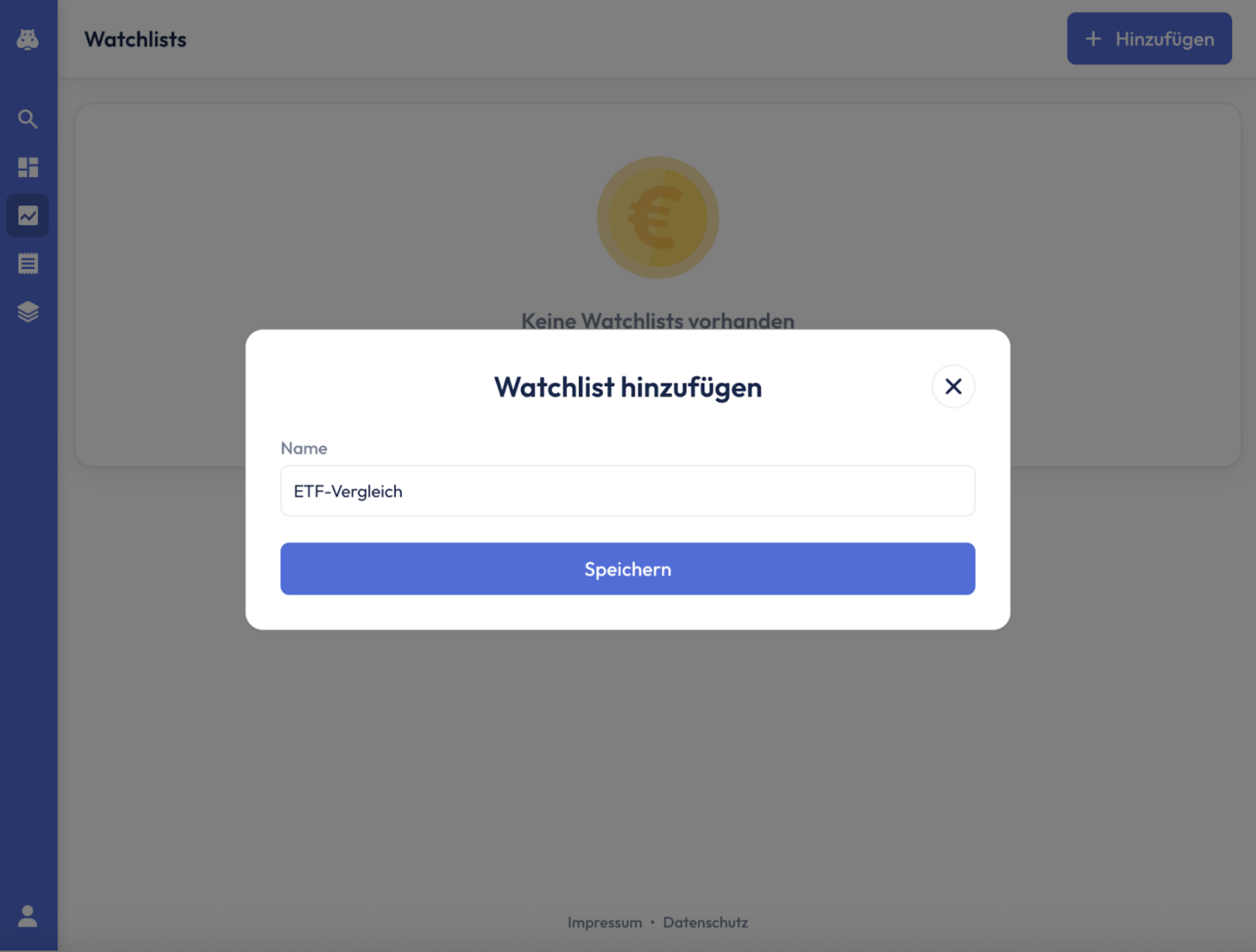 Wenn du ein PLUS Abonnement abgeschlossen hast kannst du auch mehrere Watchlists erstellen, wenn du zum Beispiel nicht nur ETFS miteinander Vergleichen möchtest, sondern auch eine Watchlist für Aktienwerte der Fahrzeugindustrie beobachten willst. Dafür gehst du auf den "Hinzufügen" Button und klickst dann auf "Watchlist". Hier kannst du dann deiner neuen Watchlist einen Namen geben, sie erstellen und dann anschließend das erste Wertpapier hinzufügen.