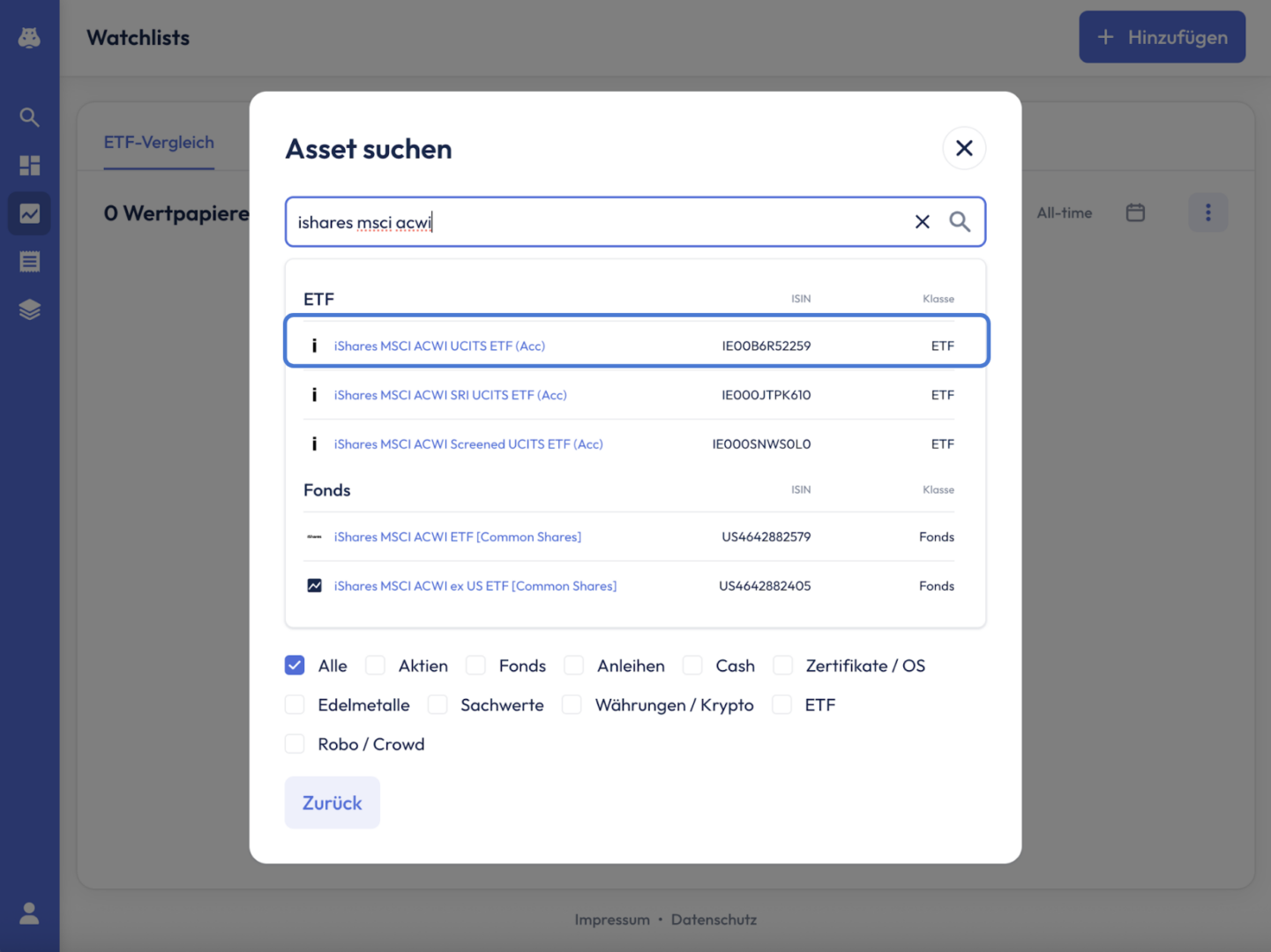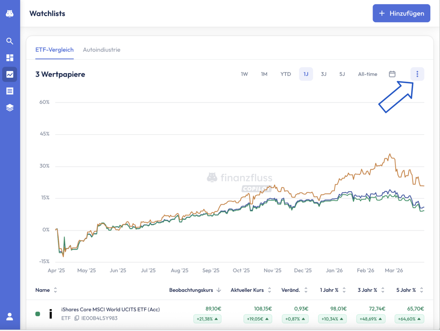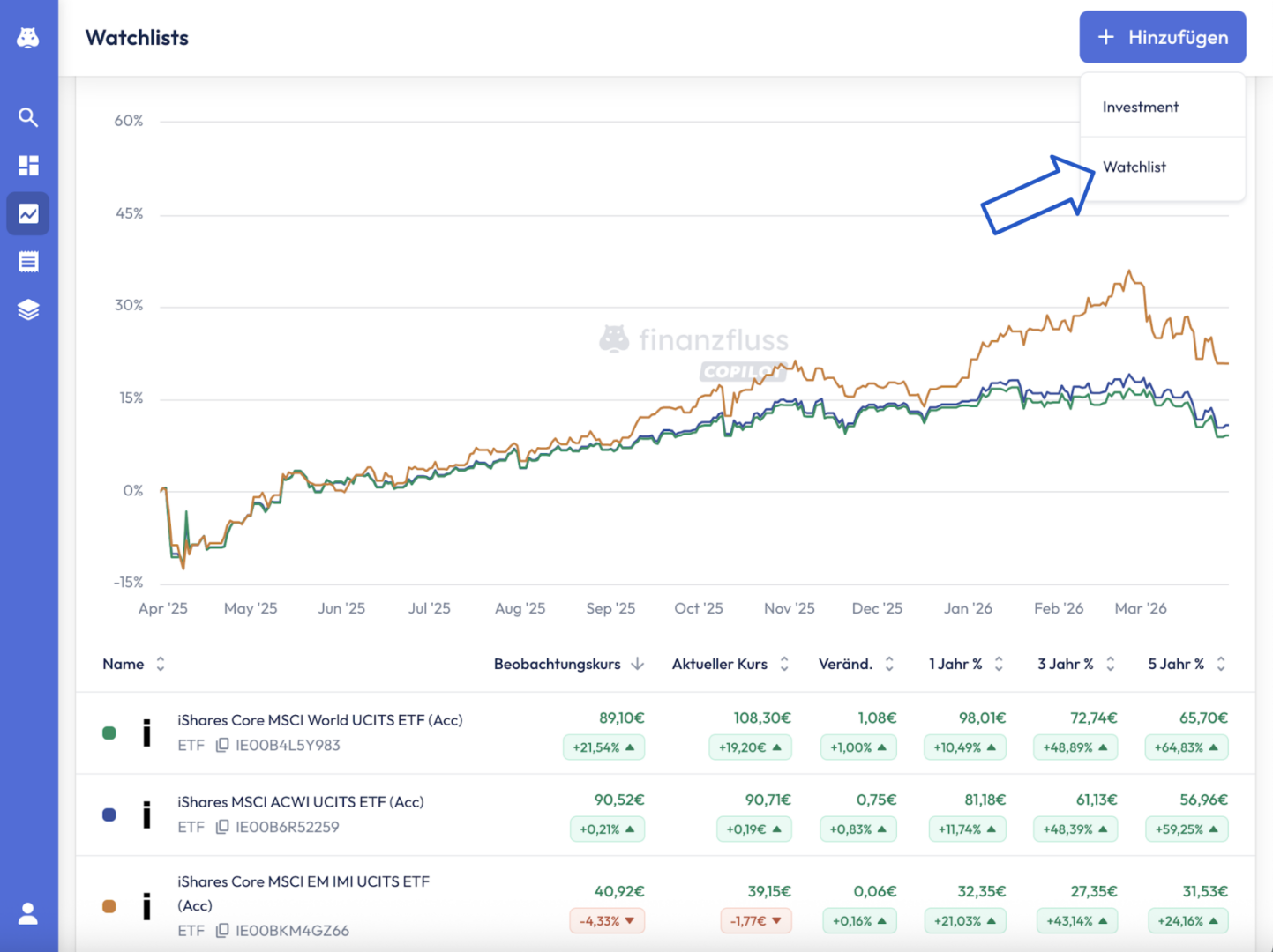 Wenn du ein PLUS Abonnement abgeschlossen hast kannst du auch mehrere Watchlists erstellen, wenn du zum Beispiel nicht nur ETFS miteinander Vergleichen möchtest, sondern auch eine Watchlist für Aktienwerte der Fahrzeugindustrie beobachten willst. Dafür gehst du auf den "Hinzufügen" Button und klickst dann auf "Watchlist". Hier kannst du dann deiner neuen Watchlist einen Namen geben, sie erstellen und dann anschließend das erste Wertpapier hinzufügen.