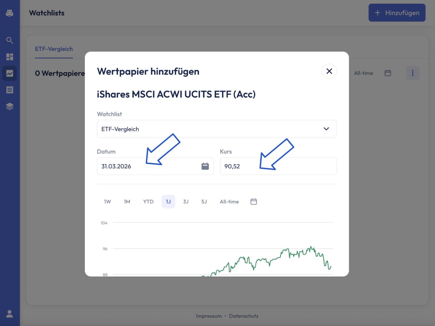 Anschließend können wir das Datum und den Beobachtungskurs eingeben, also den aktuellen Kurs des Vermögenswertes zu dem Zeitpunkt der Erstellung der Watchlist. Als Beobachtungswert kannst du allerdings auch z.b deinen Wunschkurs eingeben, also den Kurs für den du die Aktie kaufen möchtest.