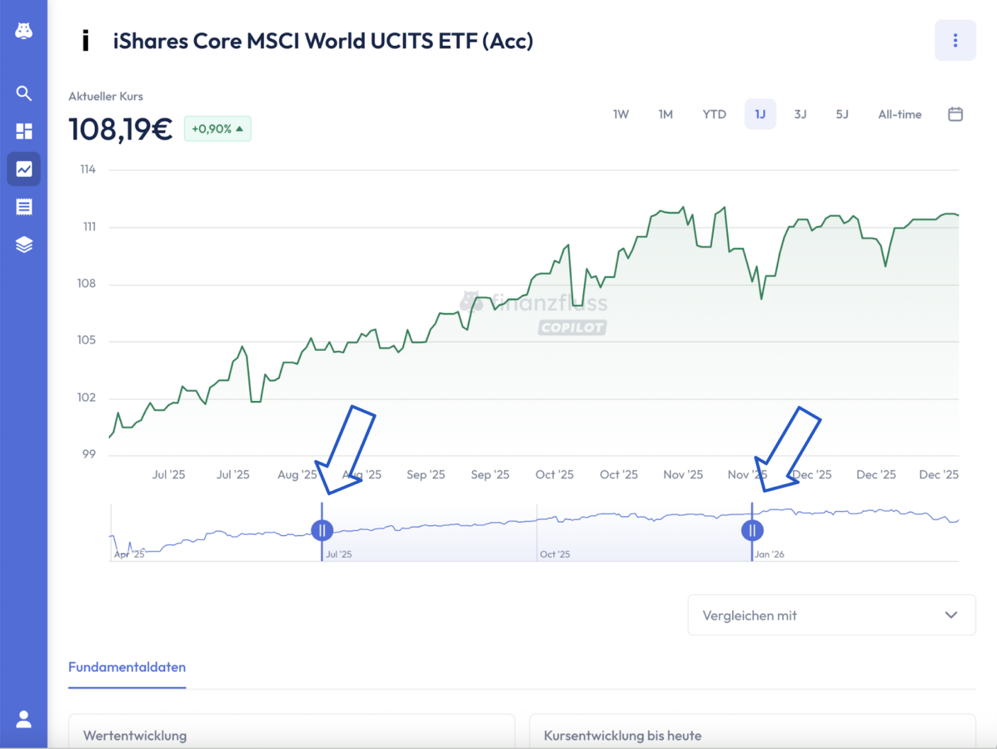 Wenn du auf eins der Wertpapiere klickst, kannst du dir die Kursentwicklung individualisierter anzeigen lassen. Durch Verschieben der blauen Balken unterhalb des Charts kannst du den Graph auf jedes beliebige Zeitintervall begrenzen.
