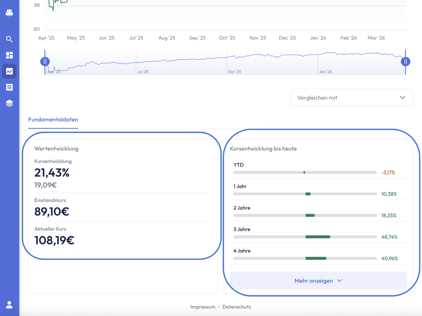 In den drei rechten Spalten wird dir jeweils die Wertentwicklung seit einem, drei bzw. fünf Jahren angezeigt. Auch hier wird der Wert in Euro und Prozent angegeben.