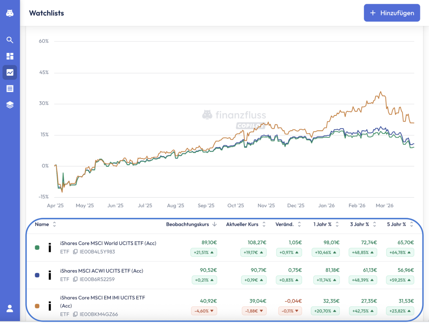 In unserem Beispiel haben wir nun die ETFs iShares MSCI ACWI, iShares MSCI EM und iShares MSCI World hinzugefügt. Deren Performance können wir über unterschiedliche Zeiträume vergleichen.