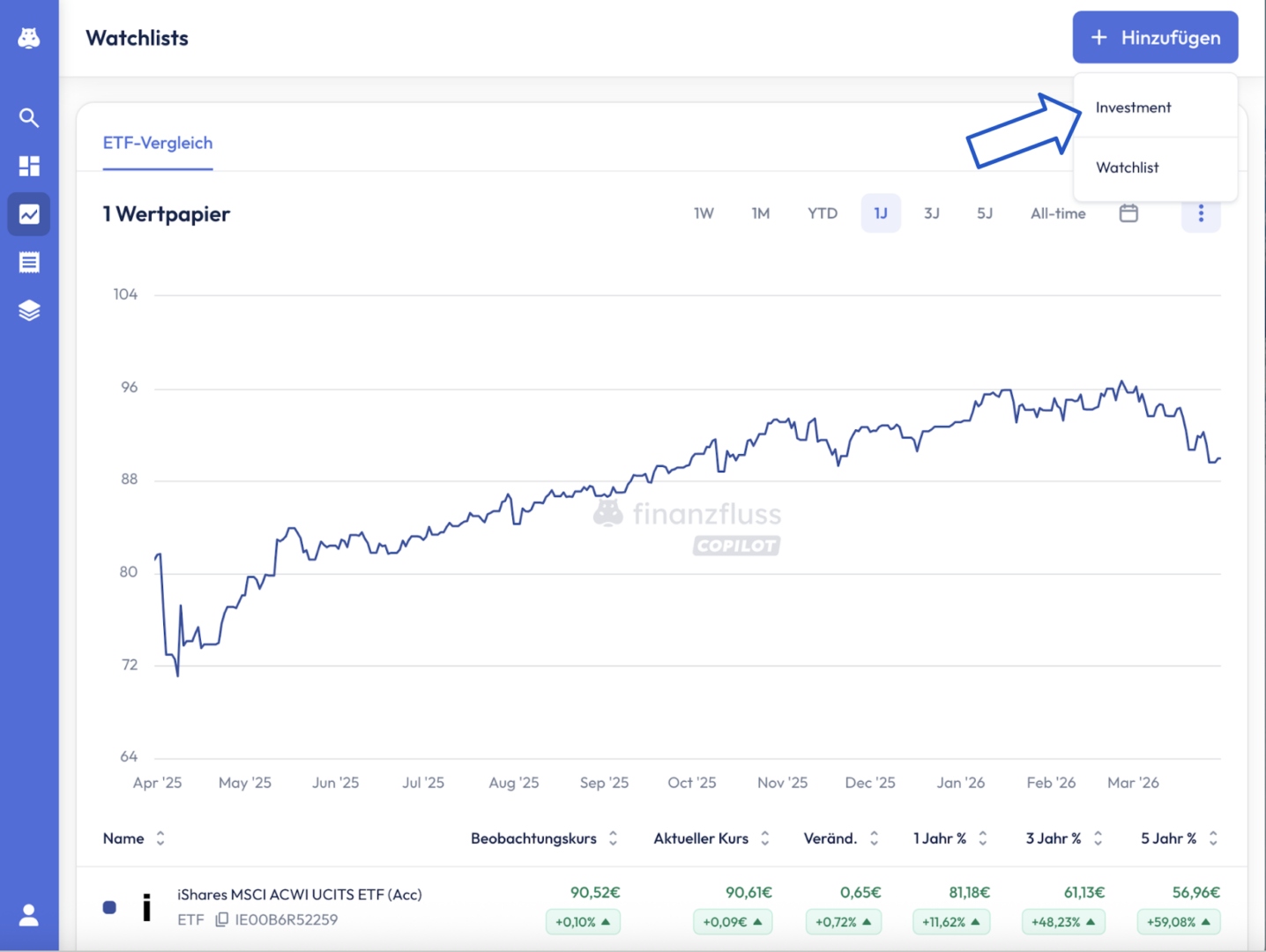 Um nun weitere ETFs in die Watchlist hinzufügen zu können, drückst du nun auf den blauen "Hinzufügen" Button oben rechts. Hier wählst du nun "Investment" aus und kannst nun wie in den Schritten davor einen weiteren ETF oder einen sonstigen Vermögenswert, für den der Copilot Verlaufsdaten abrufen kann, hinzufügen.