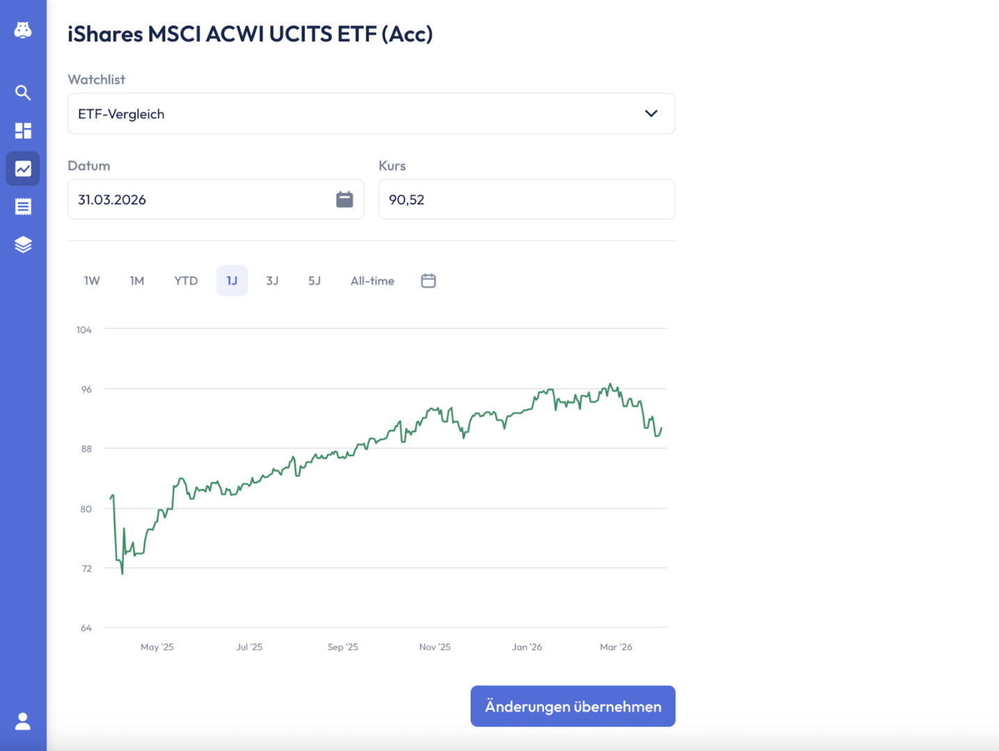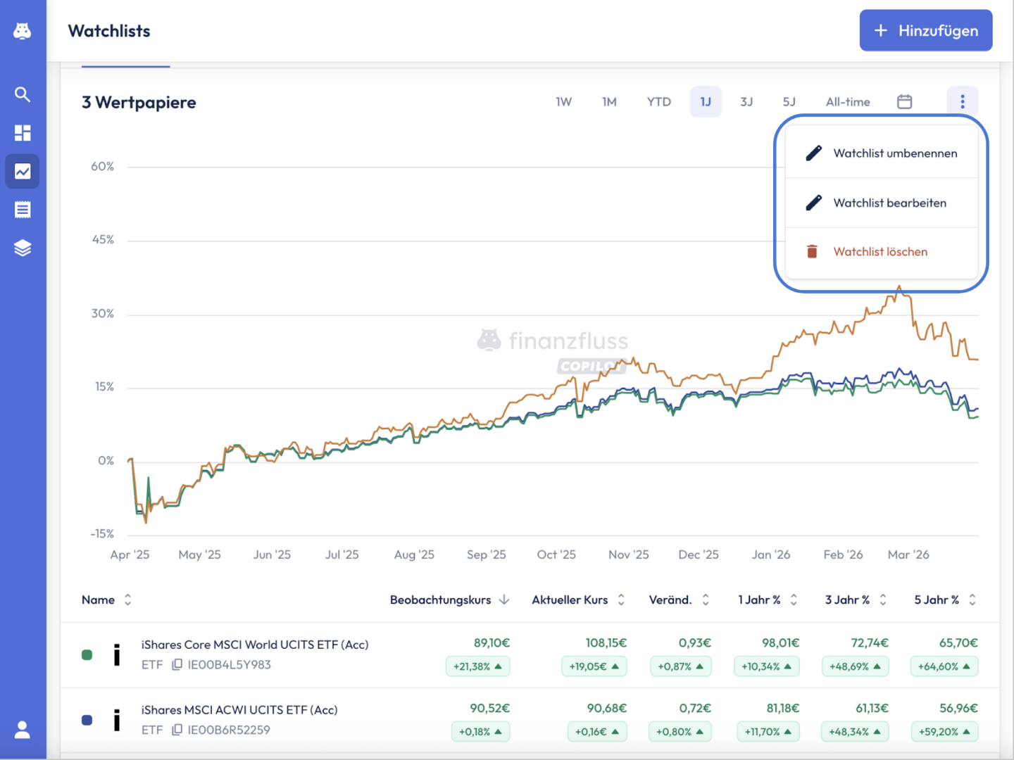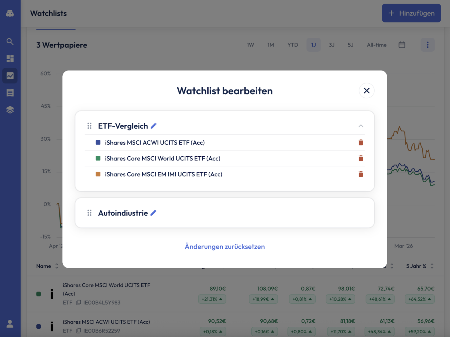 Über „Watchlist bearbeiten" lassen sich einzelne Investments gezielt aus der Watchlist entfernen.