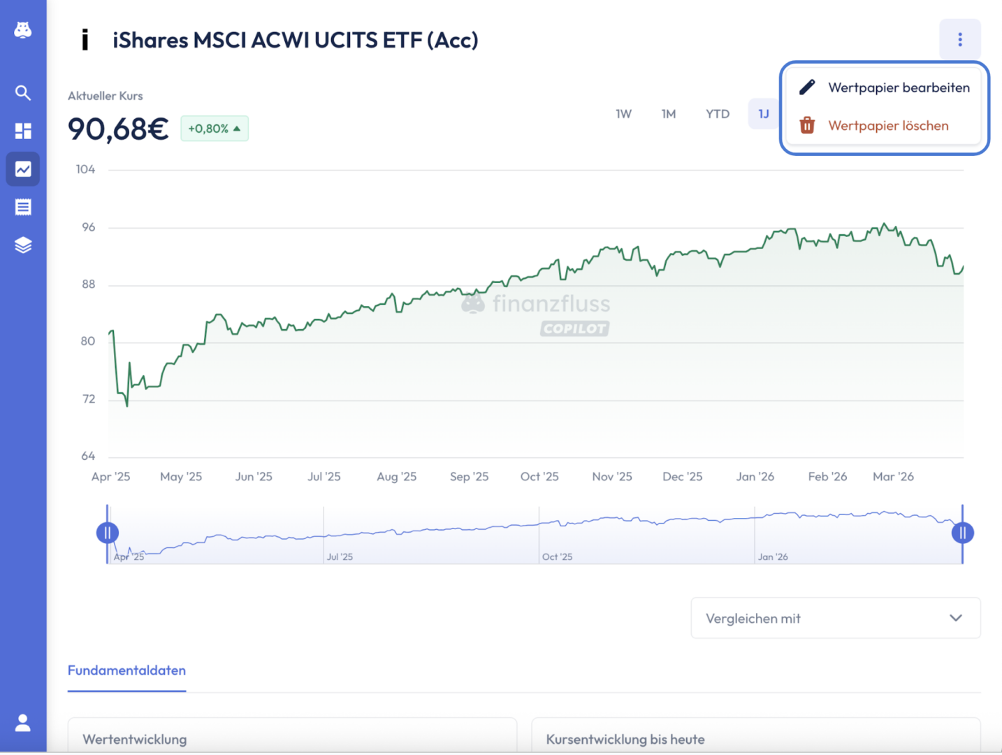 Du kannst einzelne Wertpapiere auch direkt in der Detailansicht bearbeiten. Klicke dafür in der Tabelle auf das gewünschte Wertpapier. In der sich öffnenden Detailansicht findest du oben rechts erneut das Drei-Punkte-Menü – hier kannst du zwischen „Wertpapier löschen" und „Wertpapier bearbeiten" wählen. Im Bearbeitungsmenü hast du folgende Möglichkeiten: